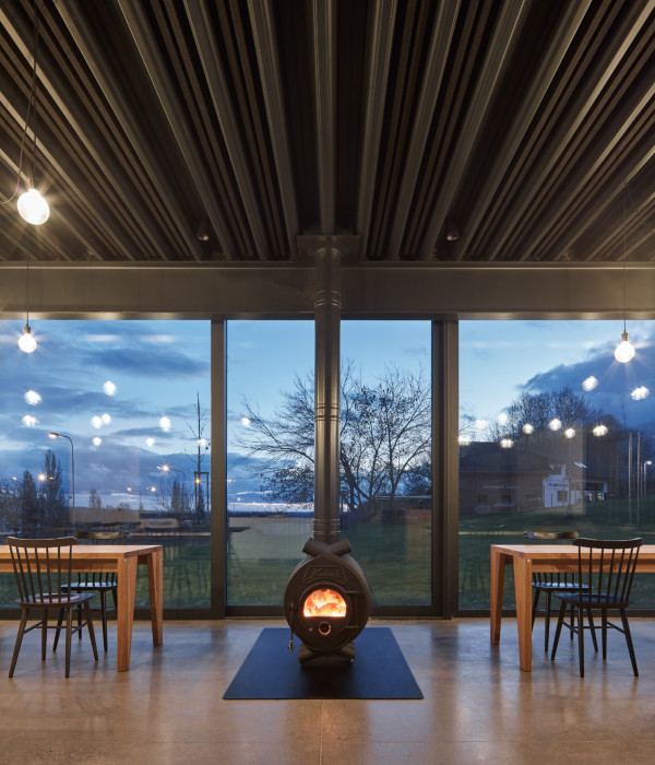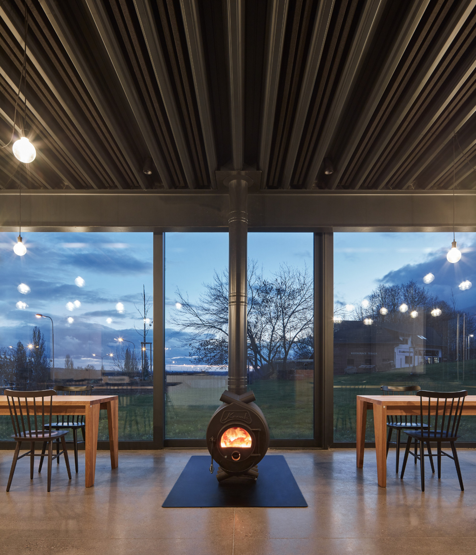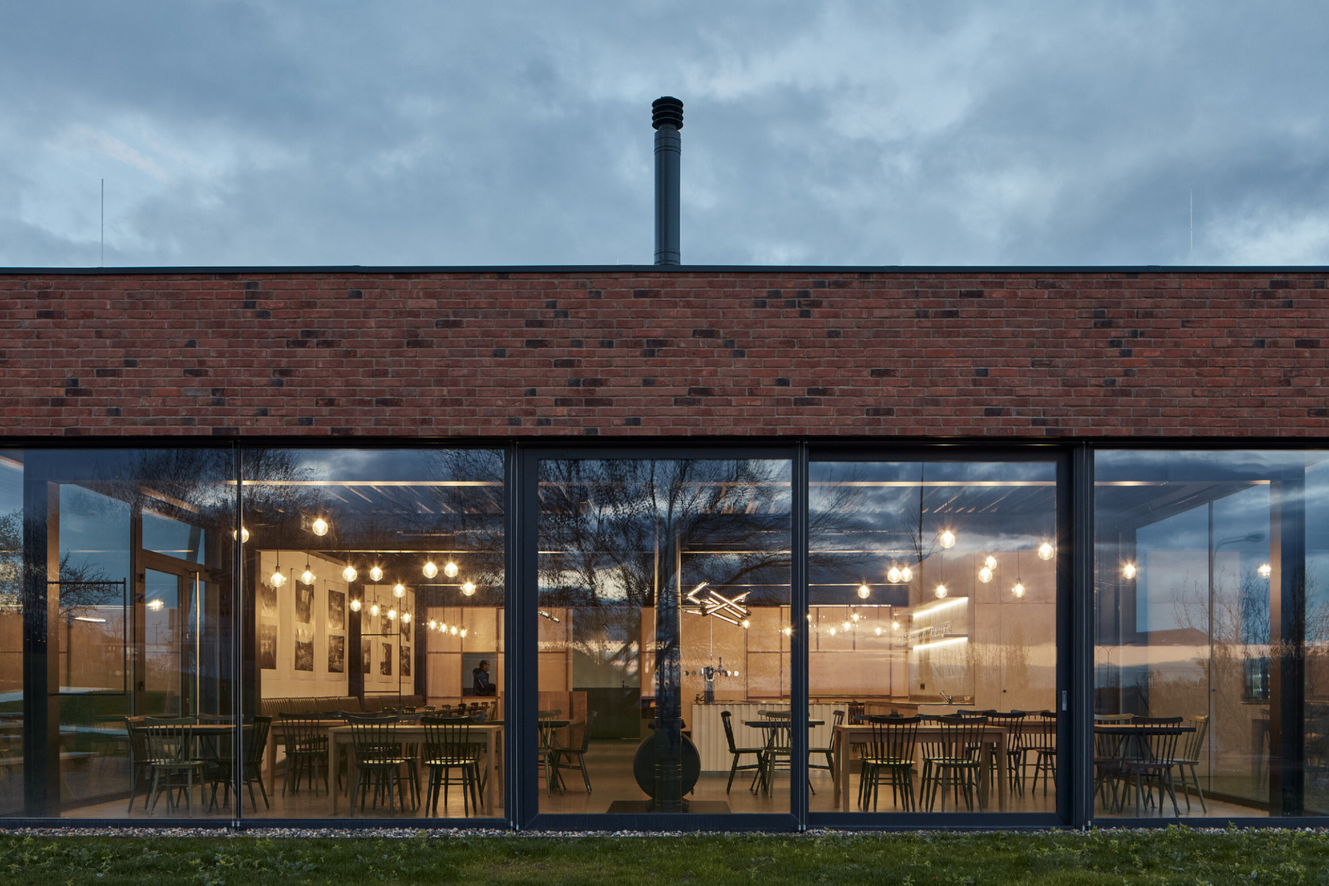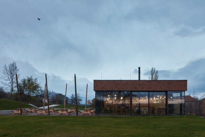 Kontakt s okolím i tvář pivovaru obecně doplňuje graficky ztvárněné logo v podobě písmene M, které je nejen základním označením piva, ale nakonec i fasády celého objektu. Logo, stejně jako celý objekt je jednoduché, čisté a na fasádě je provedeno z černého ocelového plechu.K restauraci také přiléhá venkovní terasa, která je z části překryta drátěnou konstrukcí po které se bude v letních obdobích popínat chmel, stejným způsobem jako na nedalekých chmelnicích.