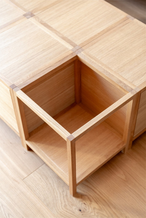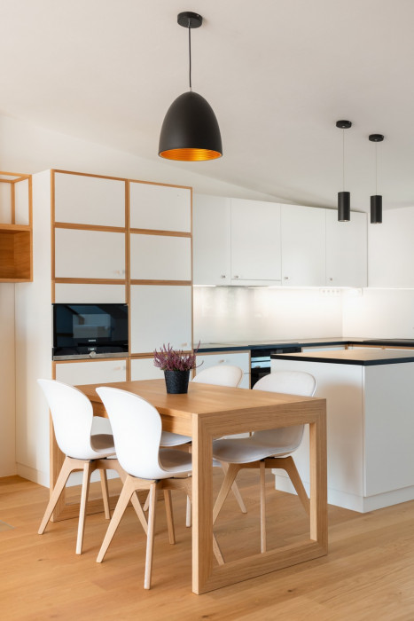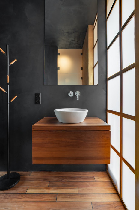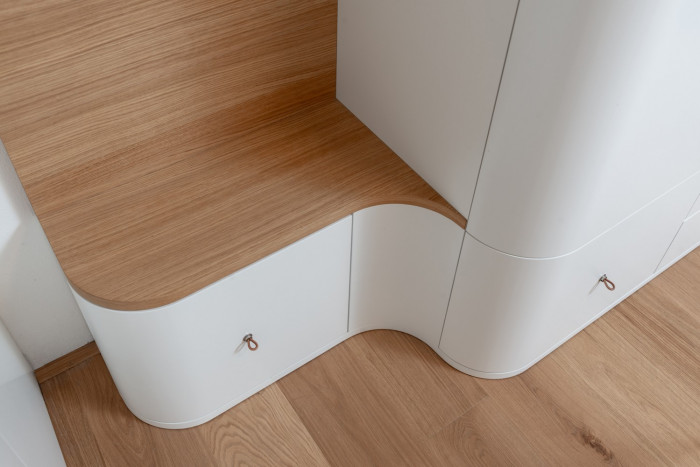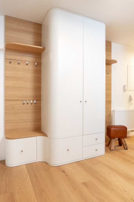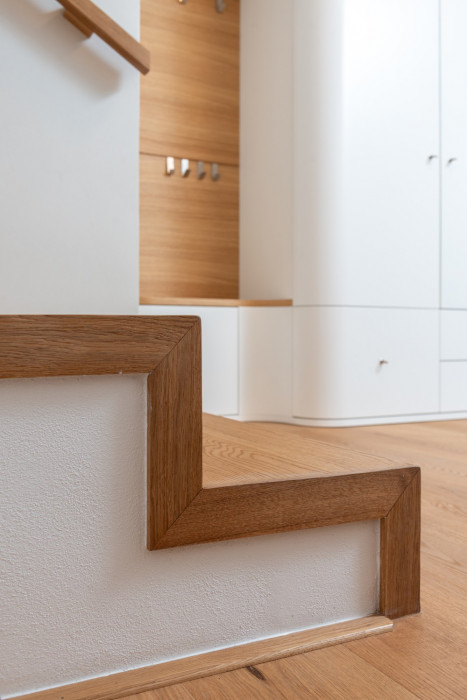 Převažujícím materiálem je dřevo na nábytku či podlaze v kombinaci s dekorativní pryskyřičnou stěrkou, jenž hrají prim v celém interiéru. Prostorové dřevěné rámečky tvoří masivní dubové hranolky. Výplně lakovaná deska, sklo nebo prázdný prostor. Tyto výplně se střídají dle funkčního či estetického uspořádání nábytku. Vše je navržené na míru, od skládající dělící stěny hostinského pokoje až po detail kuželovitých úchytek. Celý interiér se nese v duchu estetické interpretace někde mezi Evropou a Asií, přesně tak, jak tomu bylo v životě klientů a naší společné komunikace.