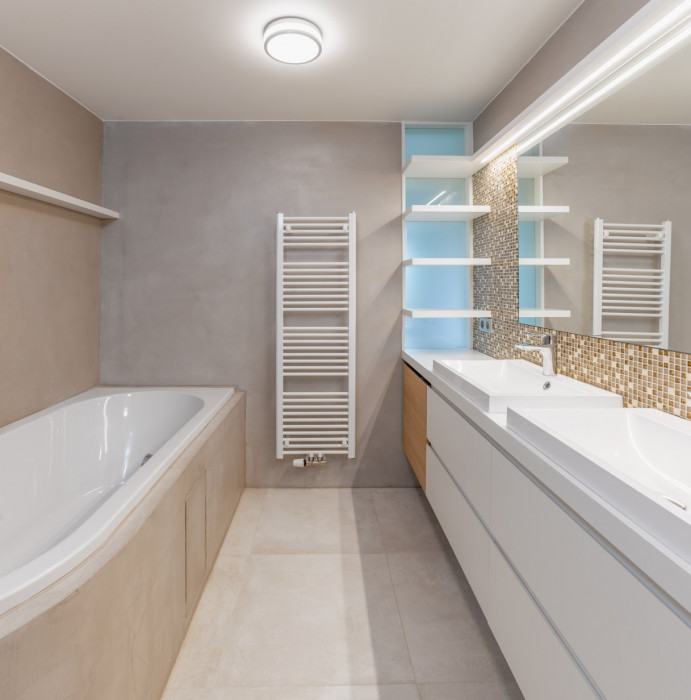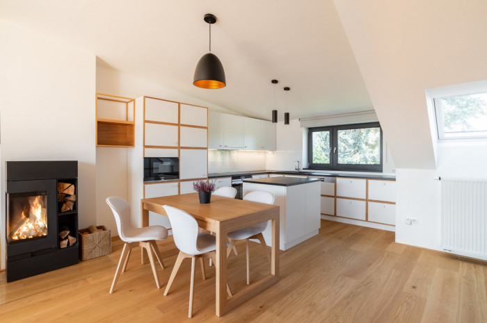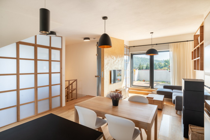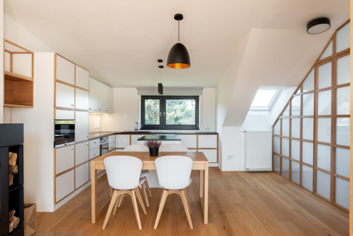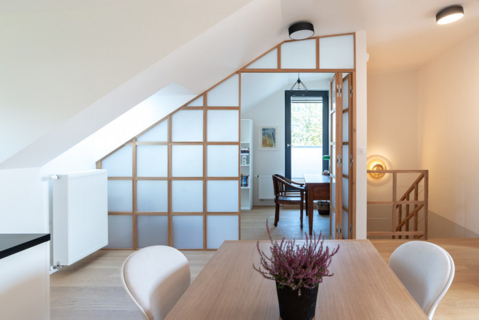 Schodiště, jako dřevěný prvek, ústí přímo do obývacího pokoje a svým tvaroslovím předjímá hru dřevěných kostiček a šachovnic v horním patře. Tento motiv je použit na obývací stěně, konferenčním stolku, TV skříňce, kuchyni i na prosklených příčkách hostinského pokoje a druhé koupelny. Celý prostor v horním patře lze rozšířit otevřením příčky do hostinského pokoje. Koupelna v podkroví má spíše relaxační charakter, proto je zde umístěn parní box a prosklenými dveřmi je propojena s terasou. Terasa svým řešením plynule navazuje na interiér bytu a poskytuje různé funkce. Na obývací pokoj navazuje odpočinkovou částí se zelení, plnící funkci optického bariéry od sousední terasy. Následuje posezení s markýzou a víceúčelovou vyklápěcí lavicí. V zadní části terasy je umístěna z důvodu soukromí perličková lázeň.