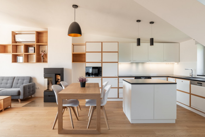 Stavební záměr řešil dispoziční změny a návrh interiéru v mezonetovém bytě novostavby bytového domu. Původní dispozice zahrnovala obývací pokoj s kuchyní, jídelním koutem ve spodním patře a v podkroví tři ložnice s velkorysou terasou. Klientům původní řešení od developera nevyhovovalo, navíc požadovali umístit hlavní společenský prostor do podkroví k terase. Z původního návrhu zůstalo pouze schodiště, vše ostatní se přeskládalo.
