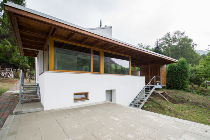 Na základě rozboru řešeného území byla nad stávajícím vyvýšeným suterénem vystavěna nová konstrukce chaty. Velkými okny je propojena s krajinou okolo řeky a naopak masivní zděnou stěnou odcloněna od hluku železnice. Celý objekt sjednocuje dřevěná lehká střecha nad přízemní částí chaty, s velkými přesahy nad venkovními schodišti a okny. Střecha dále přechází nad terasu a svou konstrukcí tak propojuje interiér s exteriérem.