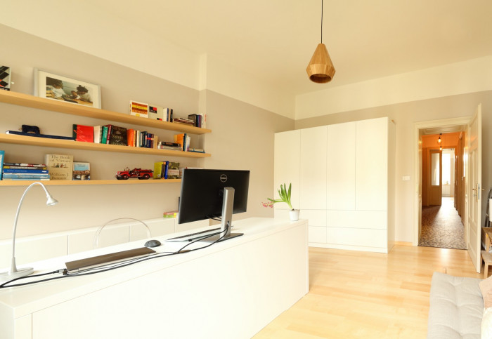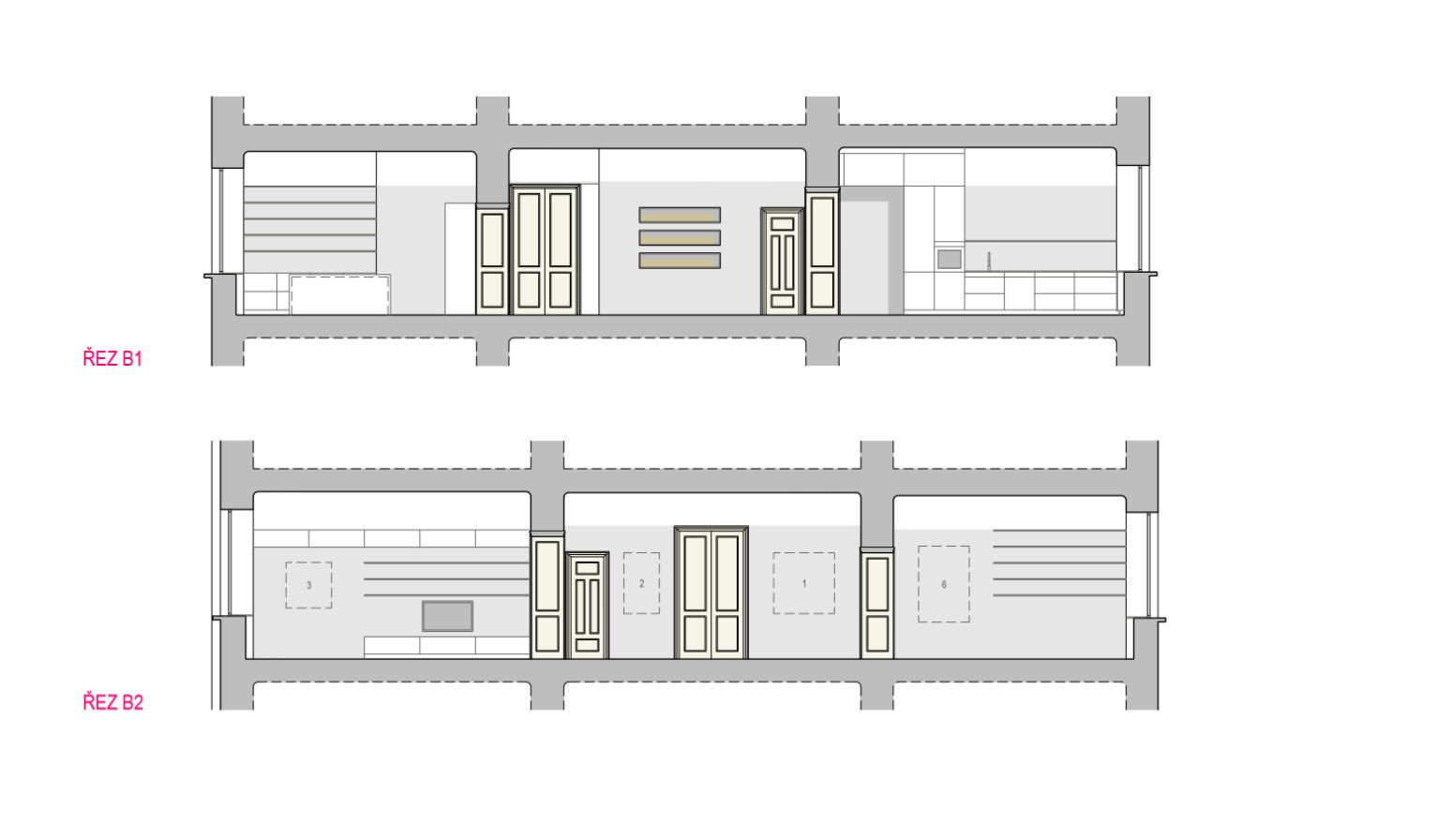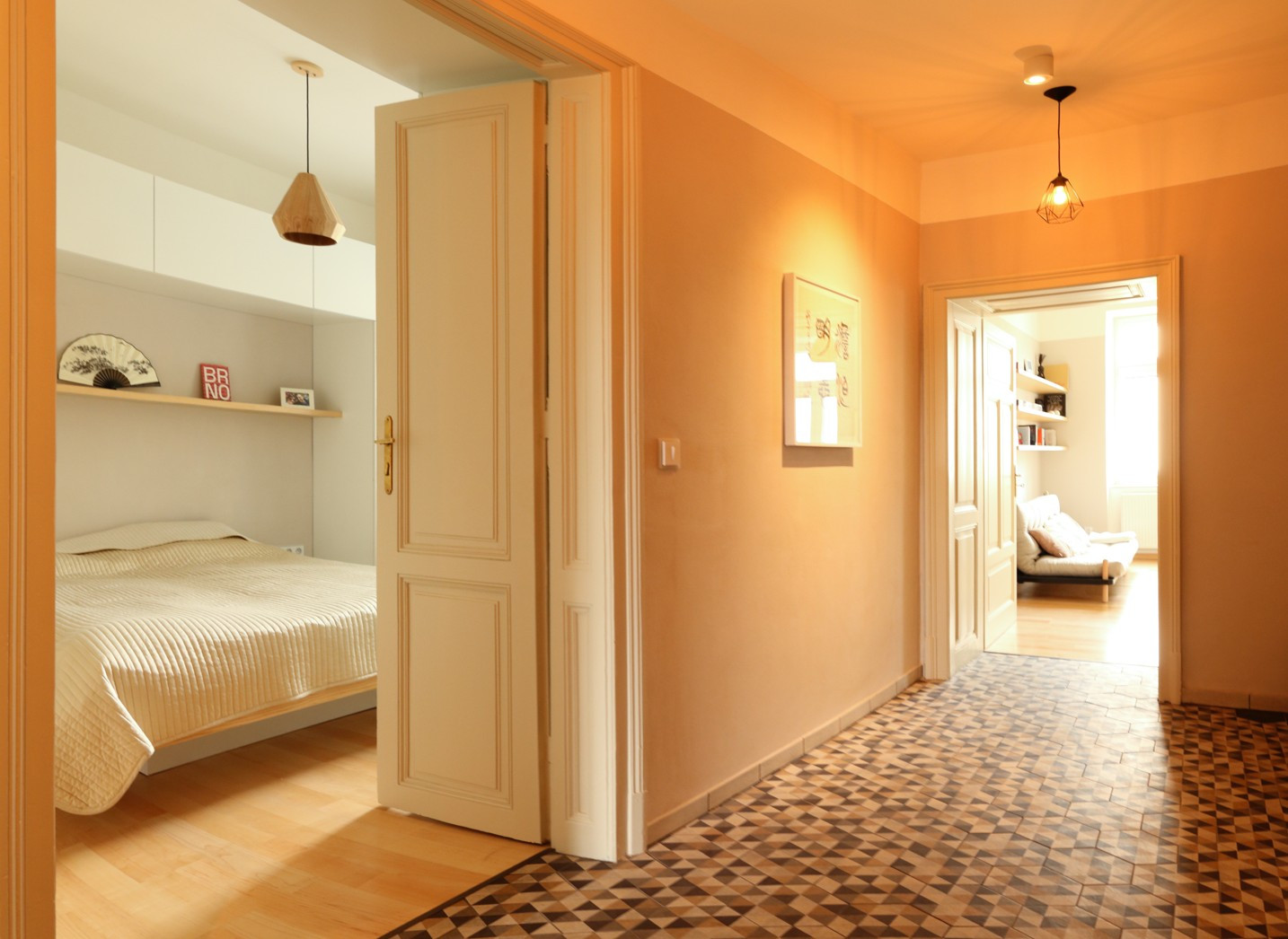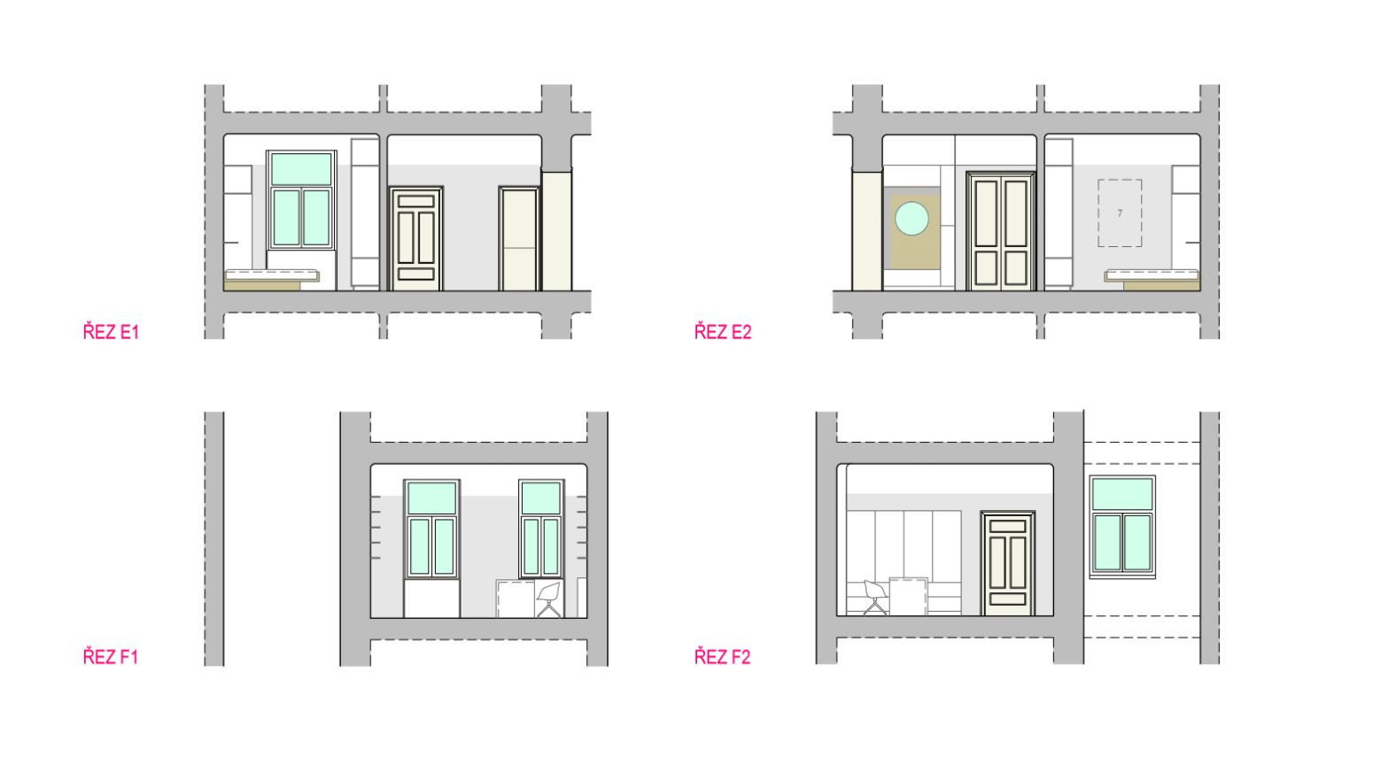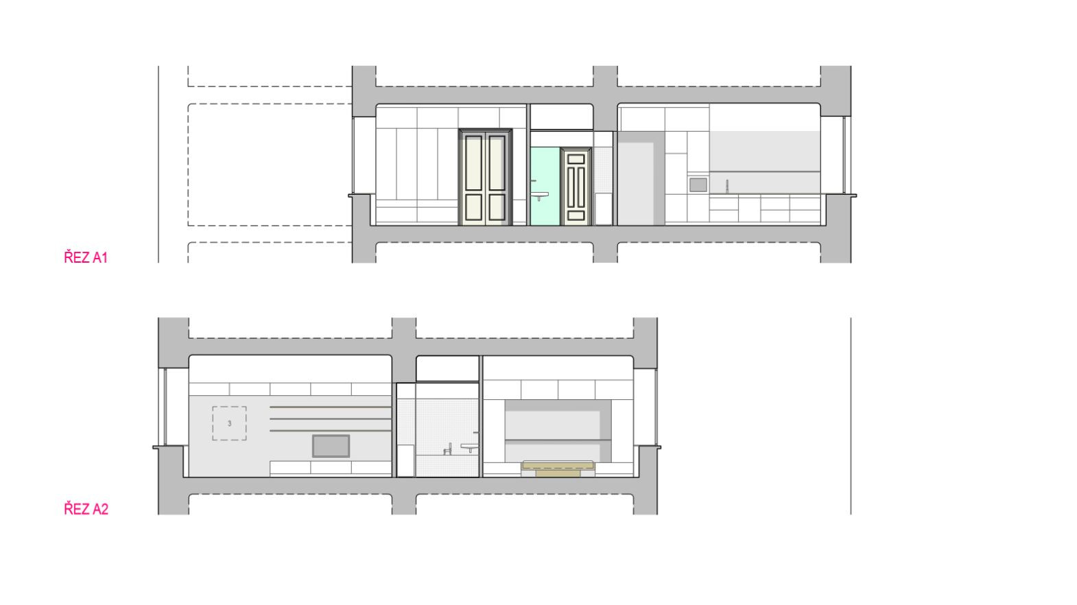 Po prozkoumání všech myslitelných variant uspořádání byl zvolen velmi decentní přístup, kdy jsou stavební zásahy redukovány na nutné minimum. To představuje vybudování nové koupelny rozdělením menšího z původních pokojů. Koupelna je situována při střední nosné zdi, v blízkosti napojení na ohřev vody a svislé vedení kanalizace. Protože byt disponuje v celé své ploše velkorysou světlou výškou (3,3 metru), je nově zbudována koupelna ve výšce 2,5 metru opatřena podhledem. Zbudování pohodlné koupelny na novém místě umožňuje dispozičně vyčistit původní kuchyni, ze které se v představeném řešení stává rozlehlá pracovna s prostorem pro přespání hostů (výhledově je možné v tomto prostoru uvažovat s jeho symetrickým přepažením, čímž by došlo ke vzniku čtvrtého pokoje). Co se týče v tomto místě zrušené kuchyně, návrh představuje variantu kuchyňské linky integrované do většího z pokojů, ze kterého se tak stává plnohodnotný obytný prostor, zahrnující kuchyni, jídelní kout a relaxační (obývákové) sezení. Kuchyňská část je do nového prostoru pomyslně vložena v podobě jakéhosi prostorového hada, který v sobě integruje kuchyňskou linku včetně vysoké sestavy, úložné prostory nad vstupními dveřmi do místnosti a napojení na parapet okenního otvoru. Ložnice je umístěna do menšího z pokojů vedle nově vytvořené koupelny. Využívá toho, že je tato místnost opatřena oknem vedoucím do jakési prosvětlovací proluky, nepříliš světlé, což však může být pro funkci ložnice výhodou.