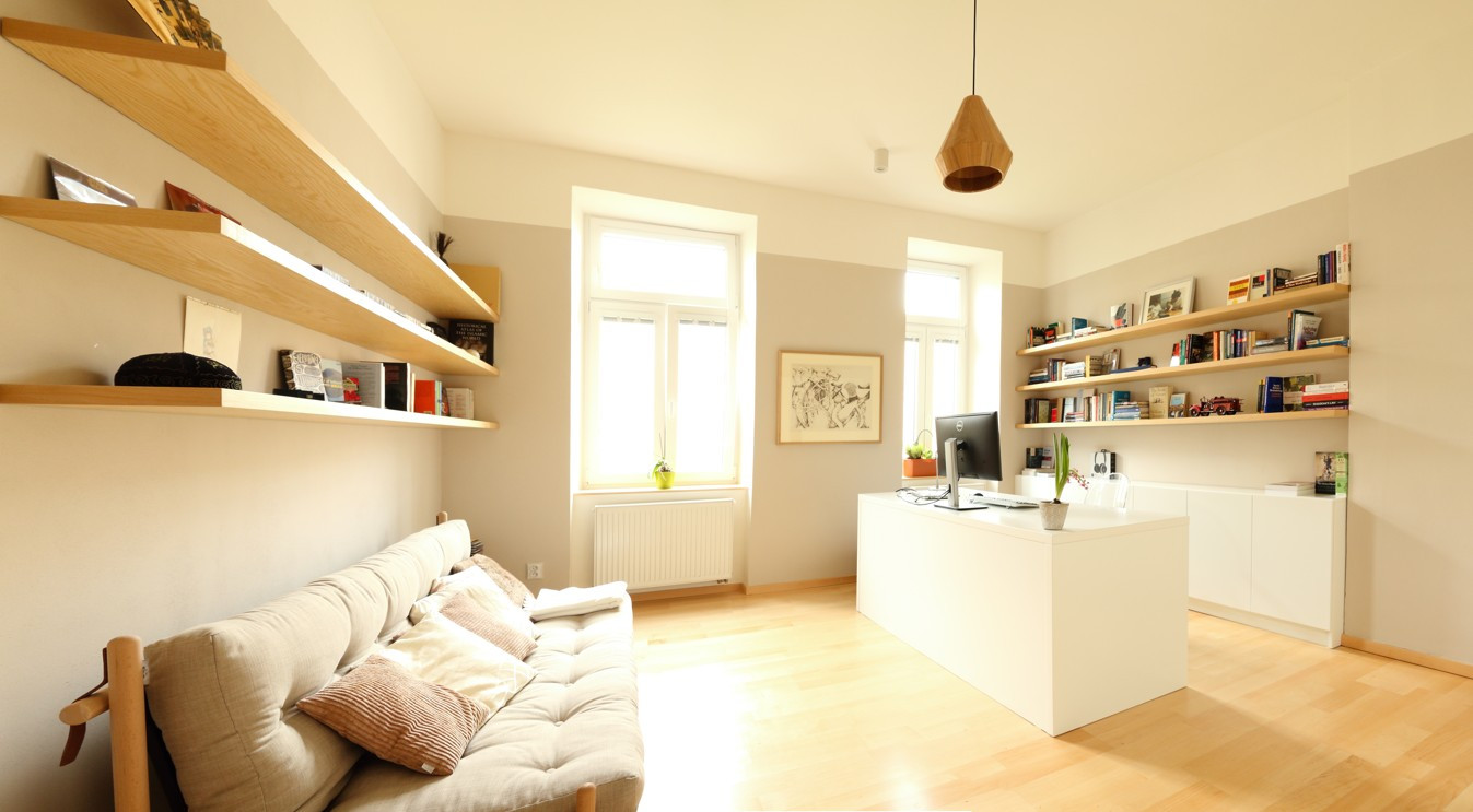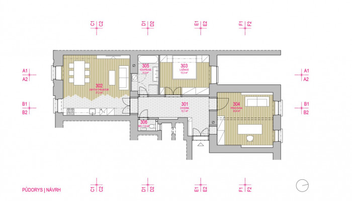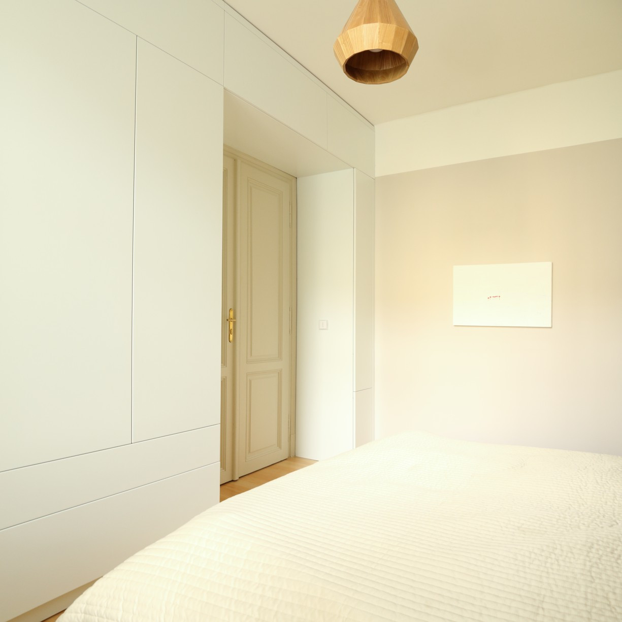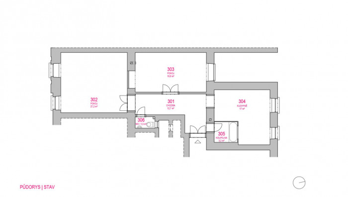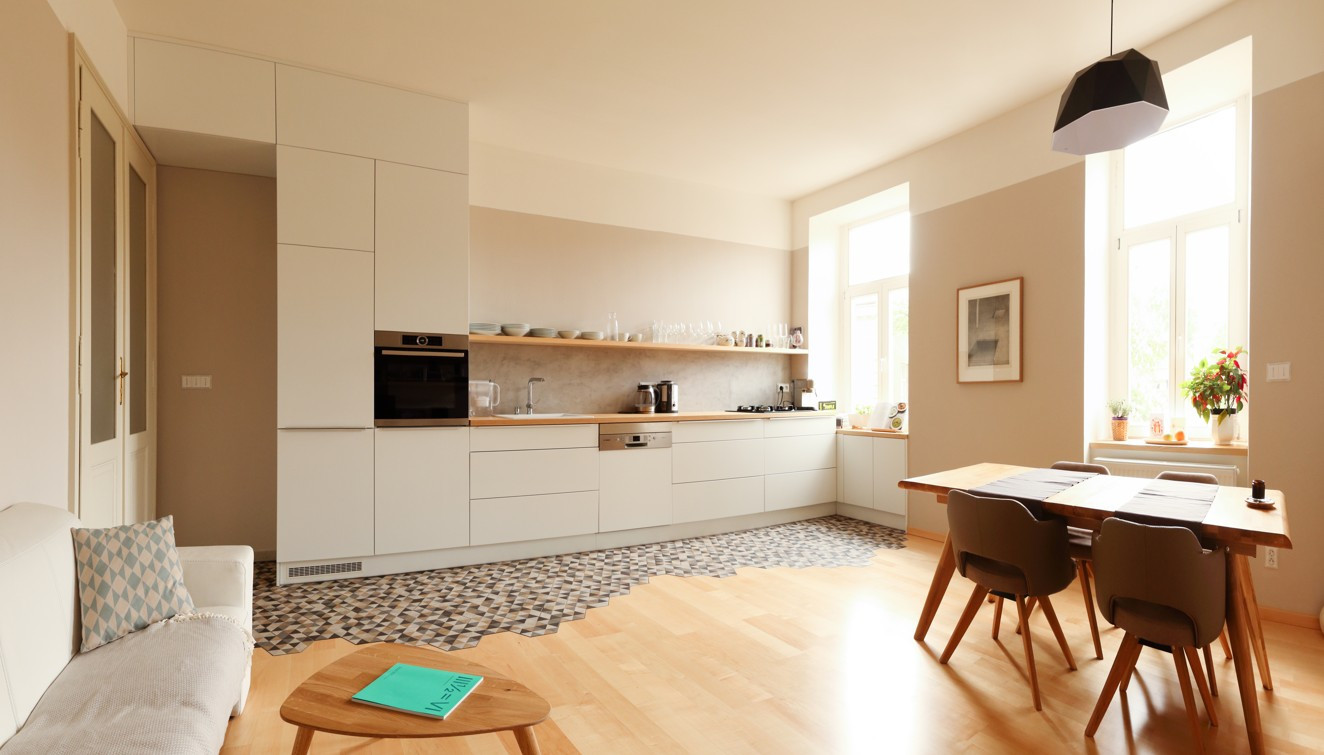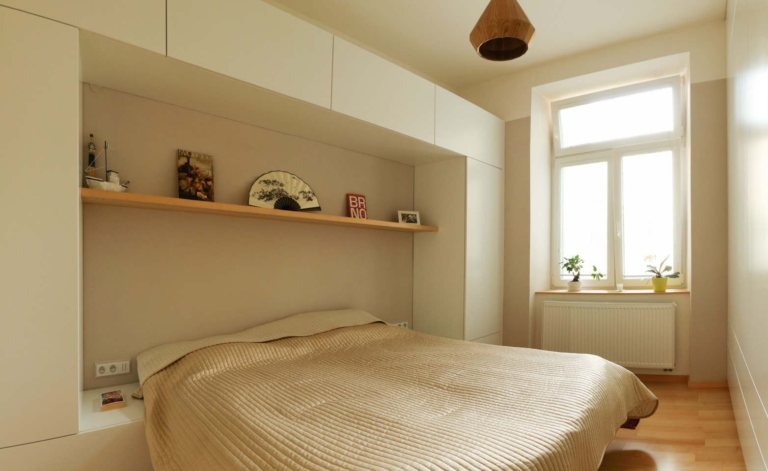Po prozkoumání všech myslitelných variant uspořádání byl zvolen velmi decentní přístup, kdy jsou stavební zásahy redukovány na nutné minimum. To představuje vybudování nové koupelny rozdělením menšího z původních pokojů. Koupelna je situována při střední nosné zdi, v blízkosti napojení na ohřev vody a svislé vedení kanalizace. Protože byt disponuje v celé své ploše velkorysou světlou výškou (3,3 metru), je nově zbudována koupelna ve výšce 2,5 metru opatřena podhledem. Zbudování pohodlné koupelny na novém místě umožňuje dispozičně vyčistit původní kuchyni, ze které se v představeném řešení stává rozlehlá pracovna s prostorem pro přespání hostů (výhledově je možné v tomto prostoru uvažovat s jeho symetrickým přepažením, čímž by došlo ke vzniku čtvrtého pokoje). Co se týče v tomto místě zrušené kuchyně, návrh představuje variantu kuchyňské linky integrované do většího z pokojů, ze kterého se tak stává plnohodnotný obytný prostor, zahrnující kuchyni, jídelní kout a relaxační (obývákové) sezení. Kuchyňská část je do nového prostoru pomyslně vložena v podobě jakéhosi prostorového hada, který v sobě integruje kuchyňskou linku včetně vysoké sestavy, úložné prostory nad vstupními dveřmi do místnosti a napojení na parapet okenního otvoru. Ložnice je umístěna do menšího z pokojů vedle nově vytvořené koupelny. Využívá toho, že je tato místnost opatřena oknem vedoucím do jakési prosvětlovací proluky, nepříliš světlé, což však může být pro funkci ložnice výhodou.