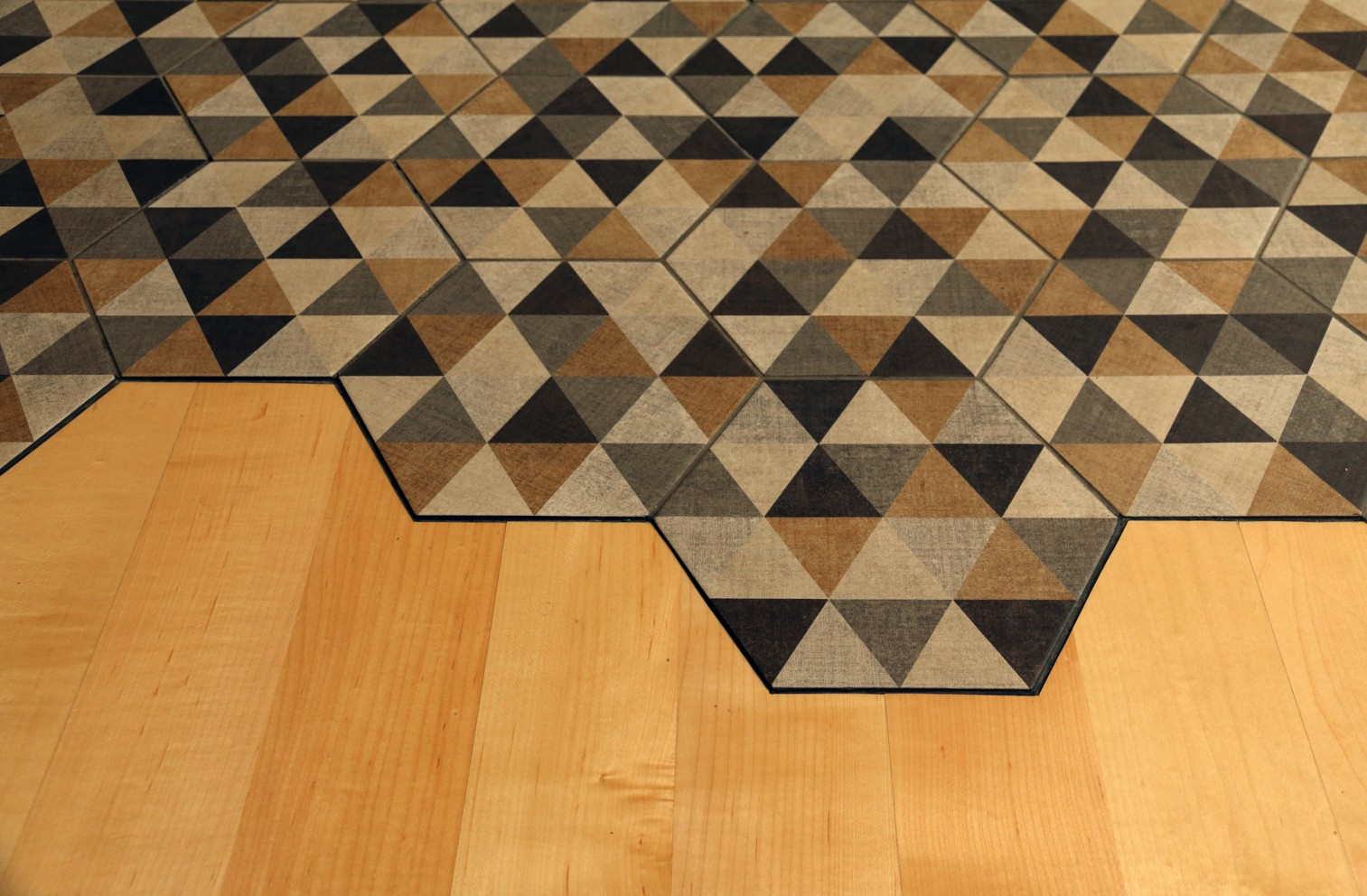 Výrazným výtvarným prvkem je pás nově dlážděné podlahy, vedoucí od vstupu chodbou, podél kuchyňské linky až k oknu v jižní fasádě. Stejná dlažba je použita i v koupelně a na WC. Použit je vzor kombinující výše uvedené barevné odstíny ve formě trojúhelníků, který je jakousi soudobou interpretací tradičních ornamentů.