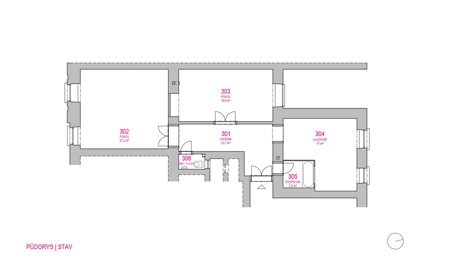 Navzdory velkorysé výměře bytu (82 metrů čtverečních) byla jeho nedostatkem poněkud nepřirozená dispozice, kdy se v prostoru chodby křížily provozní vazby společenské a klidové zóny bytu. Konkrétně se tento fakt projevoval v odtržení obývacího pokoje (při jižní fasádě) od kuchyně (situované u fasády severní). Podobně narušena byla vazba ložnice - koupelna. Kromě toho trpěly prostory bytu celkovou morální zastaralostí všech materiálů, povrchů a technického vybavení, zejména rozvodů TZB (topení, plyn).
