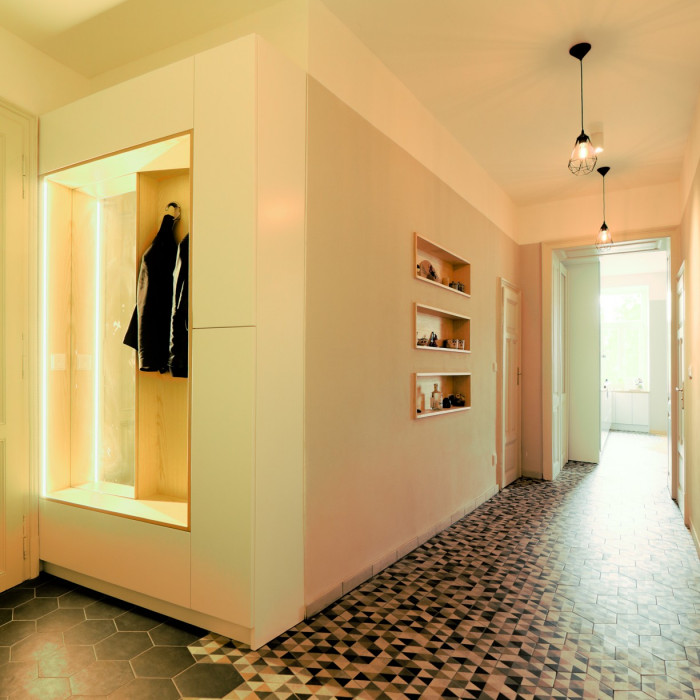 Co se týče vstupního prostoru, jeho dimenze se nemění a jde spíše o úpravy renovujícího charakteru. Jsou zde navrženy nábytkové kusy bezprostředně za vstupními dveřmi ve smyslu úložných prostor, v podélné části chodby pak vzhledem k její šířce tuto funkci plní tři niky ve zdi, jež je fakticky obvodovou konstrukcí světlíku a díky čemuž tuto úpravu její tloušťka snadno umožňuje. Obecně je nové uspořádání vytvořeno s ohledem na celkovou vyváženost a správnou proporci jednotlivých prostor samotných i vůči sobě navzájem.