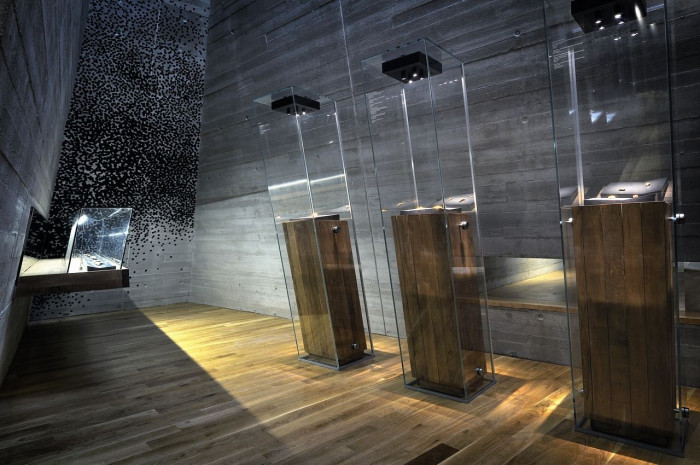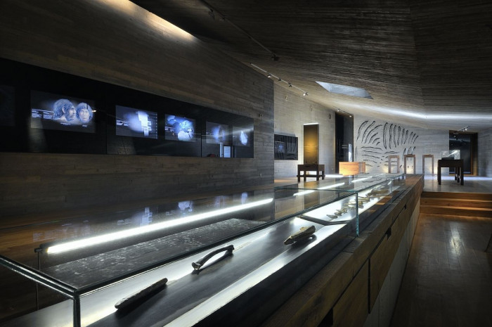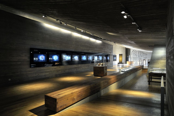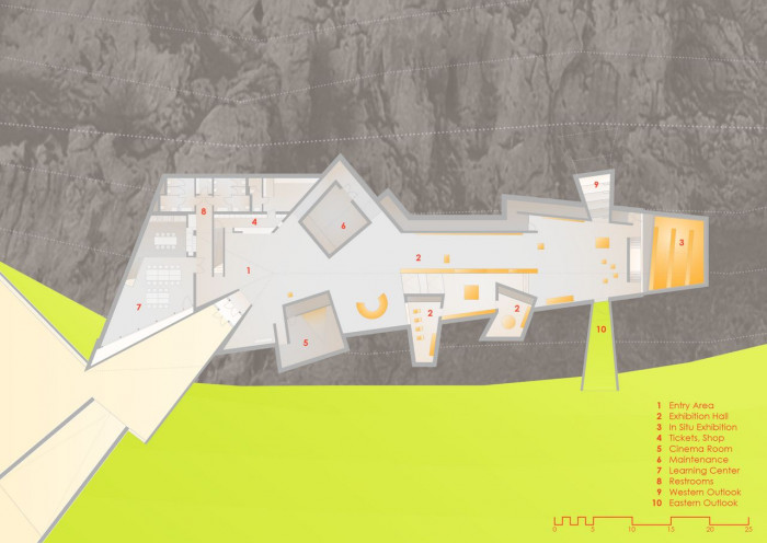 Hlavní výstavní prostor, administrativní, technické a sociální zázemí je ukryto ve svahu. Do exteriéru vystupují prosvětlovací věže, nálevkovitě tvarovaný vstup a výhledy na Děvičky a jezero. V rovině motivů je stavba spojena s plasticky tvarovanými jeskynními prostory. Pokud se jedná o materiály, používáme soudobé vyjadřovací prostředky: monolitický reliéfní beton, dubové dřevo a sklo. Vstupní předprostor vymezený gabionovými zdmi tvoří vstupní zónu do archeoparku. Prostor je multifunkční, nabízí možnost provozovat přírodní divadlo a další aktivity.