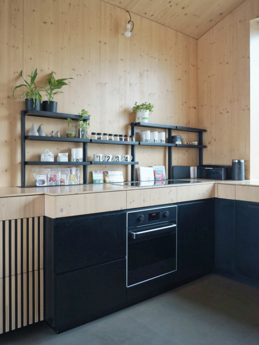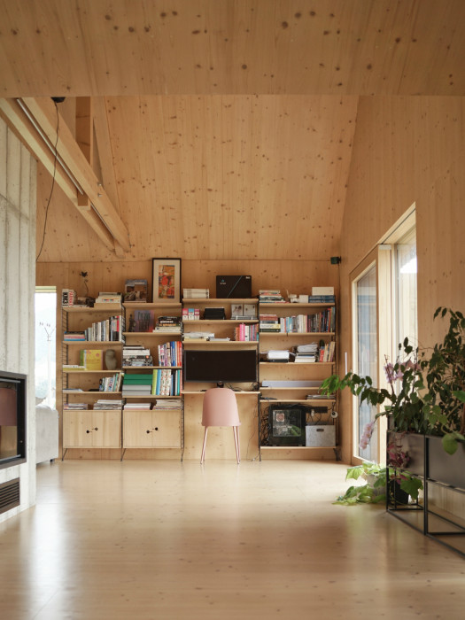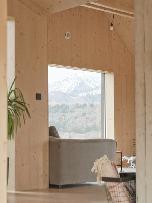 Interiér rodinného domu je jednoduchý, funkčný, udržateľný. Použité sú prírodné materiály doplnené čiernymi akcentami a kombinovaním drevených plôch so striekanou MDF v čiernej farbe. Interiér domu materiálovo odzrkadľuje konštrukčným systém stavby, zemité farby a kresba dreva sú jeho silným nositeľom.