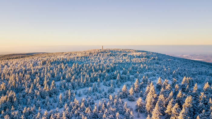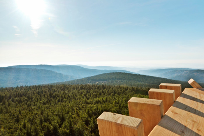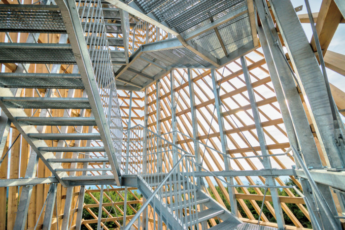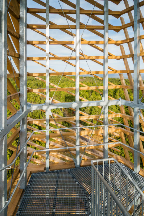architektonické řešeníZáměrem architektonického řešení je materializace konceptu deště.Stejně jako je déšť formován větrem, je pětiboký půdorys zformován tvarem vrcholových vrstevnic hory Velké Deštné. Hmota či objem vlastní rozhledny byl formován prostým „vytažením“ půdorysu do požadované výšky. Abstraktní minimalistická hmota udržuje volné sepětí s místem díky tvaru půdorysu.Proudy deště byly transformovány do tenkých tyčových prvků konstrukce rozhledny. Různé směry dešťových přívalů hnaných větrem se propisují do směrů prvků, které se kříží na jednotlivých stěnách rozhledny.Vizuální odkaz na proudy deště je posílen plastickým rozšířením na části latí vnějšího diagonálního pláště. Jinak plošné fasády tak získávají další rozměr, který je možné ještě zvýraznit využitím materiálu s odlišnou povrchovou úpravou. Tento výtvarný prvek vrací do racionální podoby rozhledny přirozenou přírodní náhodnost.Tento dojem je podporován také vizuální proměnlivostí rozhledny při změně pozorovacího stanoviště kolemjdoucích. Proporce rozhledny se plynule mění díky nepravidelnému pětibokému půdorysu. Vlivem orientace tyčových prvků venkovního pláště kolmo ke středu rozhledny navíc dochází k postupnému uzavírání a otevírání průhledů skrze jednotlivé stěny.