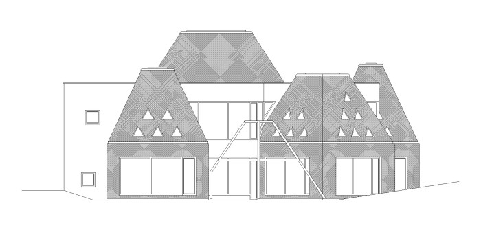 Rozdělili jsme hmotu na několik částí. Kostka, v které je zázemí, kanceláře, vstupy, vše nutné pro praktické fungování. Na to se pak napojují jednotlivé třídy, které už nejsou obdélníkové a navazují na zahradu. Jsou to volně tvarované světy na hraní. Pagody tvoří siluetu domu a zevnitř skrýš, indiánské tee-pee, prostor, kam dopadá světlo z trojúhelníkových oken, přiznané dřevěné konstrukce jako větve stromu. Vstupní atrium, zde je pavoučí síť, herní prostor přístupný ze všech tříd, lanové centrum přímo v budově, doufáme, že bude využíváno a děti se budou houpat a létat. Síť je nesena kmeny stromů, jimž bylo za jejich službu poděkováno. Atrium slouží i jako komunitní prostor pro zpívání, hraní, výstavy, divadlo.