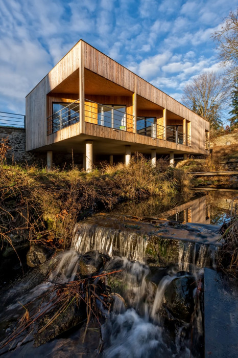 Vše navrhováno a stavěno s pokorou a hledáním souznění mezi historií místa, krajinou vodopádu a současné architektury. Postaveno svépomocí za velké pomoci rodiny a kamarádů, za použití přírodních a tradičních materiálů.