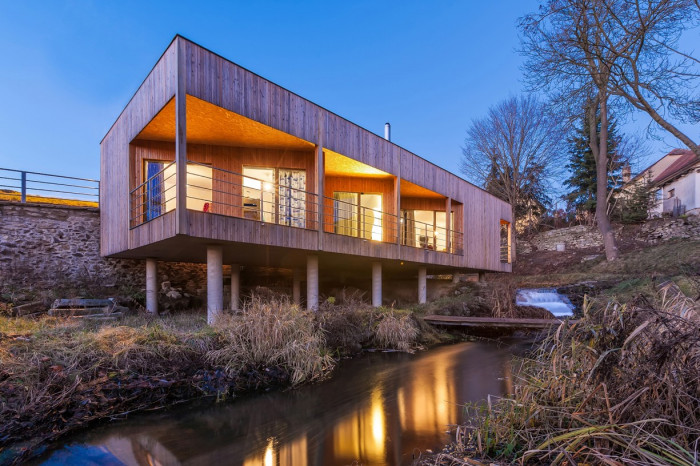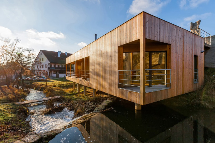 Aby dům splynul s geniem loci pod hrazeným přepadem horního Ulického rybníka, byla navržena dřevěná fasáda ze sibiřského modřínu bez povrchových úprav jako vzpomínka na původní dřevěné mlýnské domky.