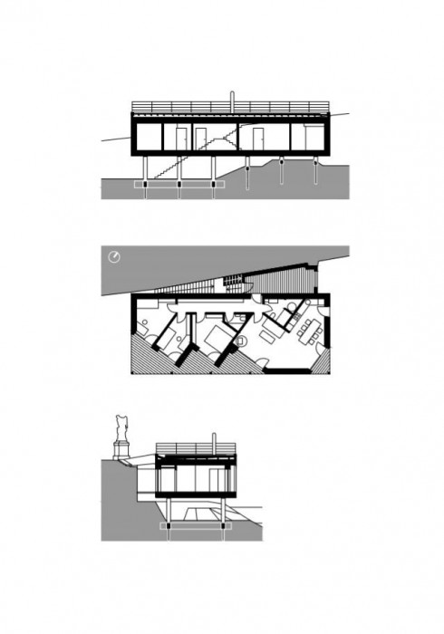 Skromně minimalistické řešení rodinného domu v pasivním standardu (reduce), postaveném na stísněné, léta opuštěné a nevyužívané parcele na hranici historického jádra města (reuse), se snahou o nalezení koncepce domu, který je možné postavit na malém pozemku tak, že zastavěná plocha bude pro bydlení využívána hned třikrát (recycle) - pod domem, v domě a na střeše.