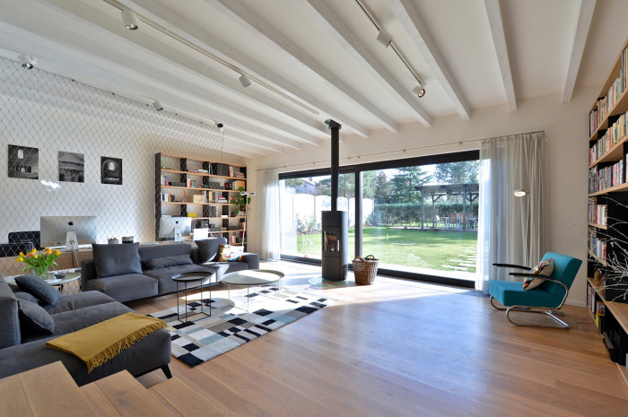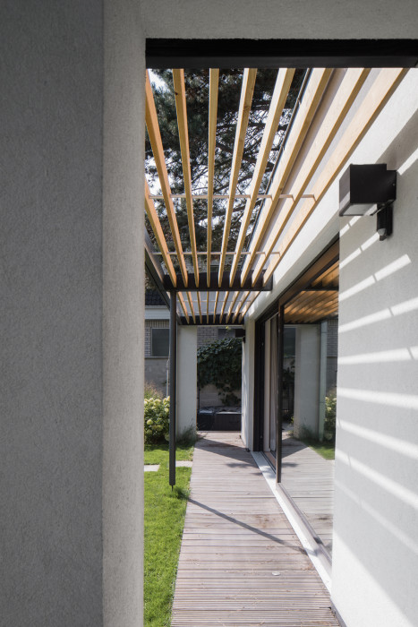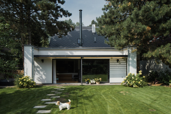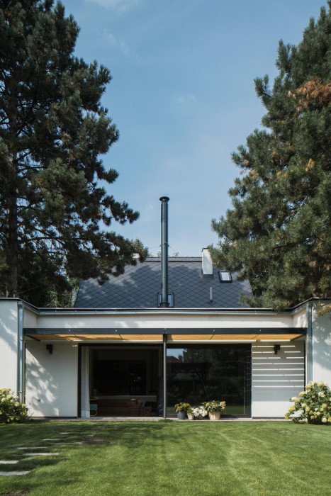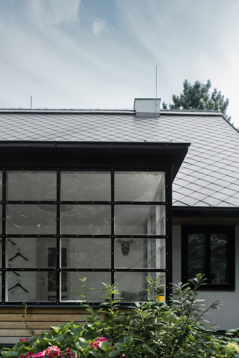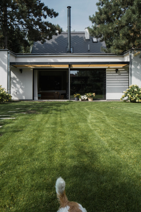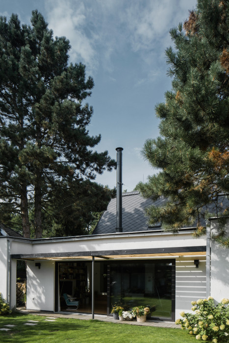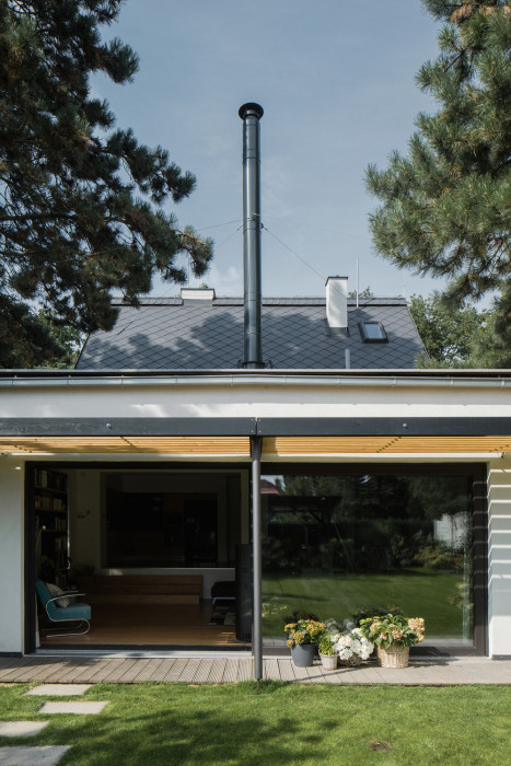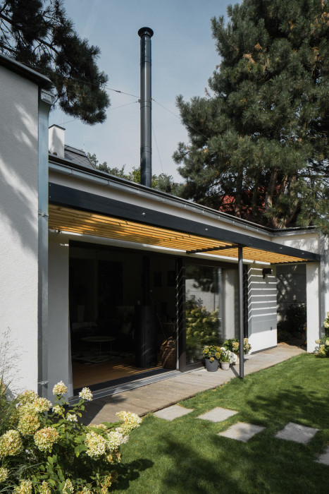 Odpovědí na tento požadavek se stala přístavba při jižní fasádě objektu směrem do zahrady. Jednoduchá hmota s pultovou střechou, s podlahou 20 centimetrů nad terénem navazuje přímo na objekt. Důvodem pro zvolené hmotové řešení byla snaha vytvořit v interiéru nový velkorysý prostor s vysokým stropem, ale současně nezakončit přístavbu směrem do drobné zahrady přehnaně vysokým průčelím.