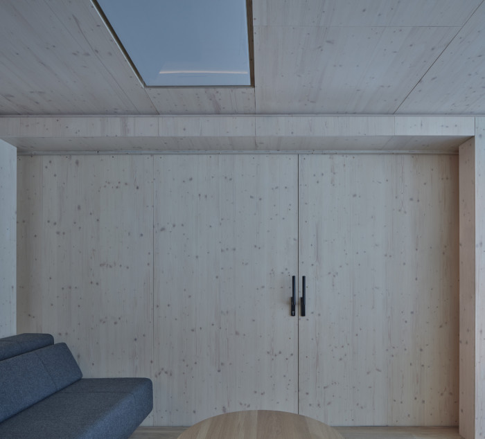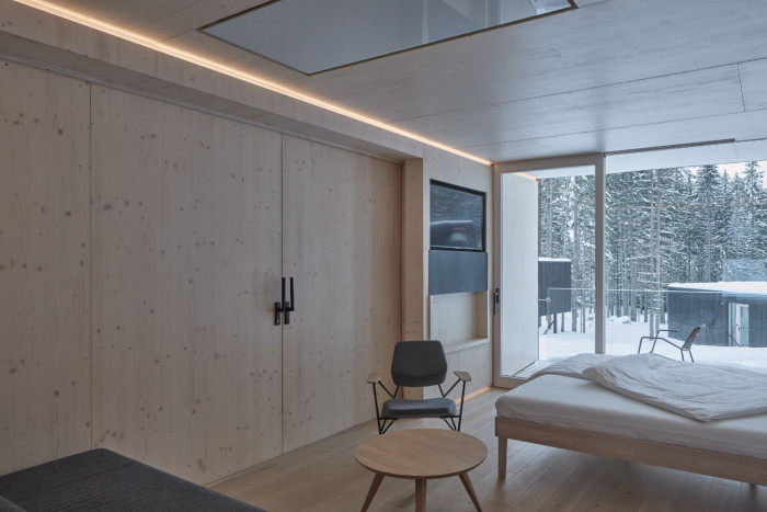 Apartmány sme riešili upravením našich modulov s jednostrannou orientáciou, výhľadov a snahou vmestenia sa s rozsiahlym programom do zadaného obrysu apartmánov klientom. Každý objekt je zložený z dvoch modulov, ktoré vždy obsahujú zvlášť apartmán so spálňo-obývačkou, detskou izbou, vstupným zádverím a hygienou. Dvojice modulov a teda sólo apartmánov komunikujú v prípade potreby posuvnou stenou, ktorá po otvorení zjednotí ich obývačky a vytvorí tak centrálny spoločný priestor kde sa vedia stretnúť obe rodiny. Tento moment premieňa kompaktné priestory buniek v komfortné rozľahlé spoločenské jadro každej chaty.