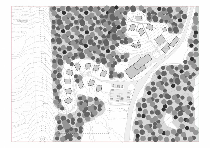 Chaty boli osádzané do lesa prednými čelami orientovanými od seba a na rôzne výhľady do lesov či na zjazdovku. Práve tento úzky kontakt s lyžiarskou zjazdovkou dodáva tomuto areálu jedinečnú atmosféru.