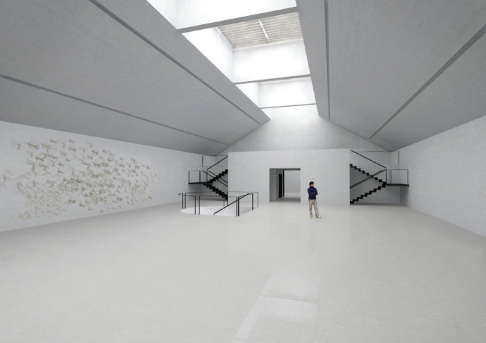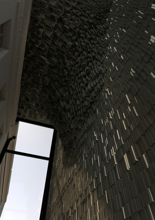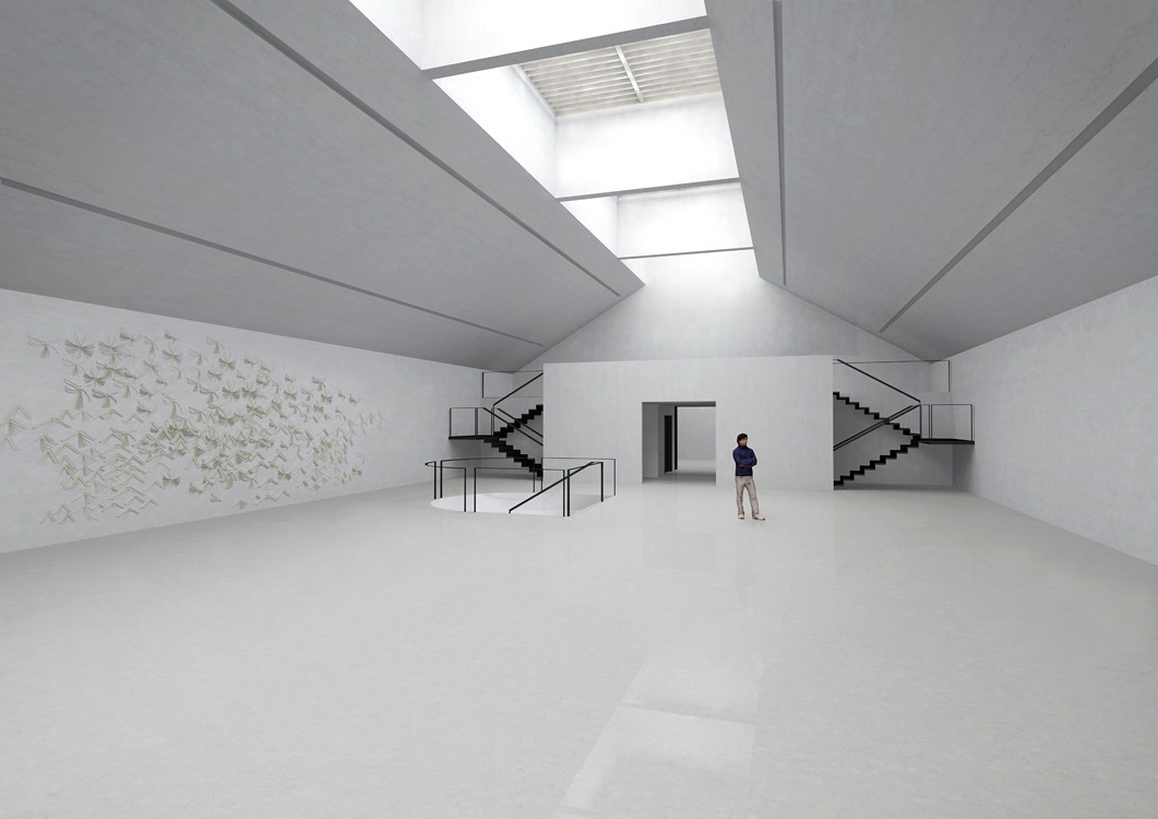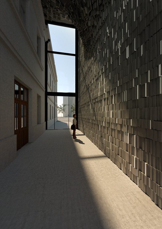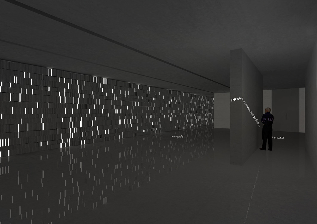 Více než dvanáct metrů vysoký prostor vstupní haly je po celé své výšce zaplněn množstvím betonových zkamenělých knih. Tato abstraktní pietní knihovna má atmosféru chrámové stěny, na které sluneční paprsky vykreslují strukturu a různorodost zkamenělých knih připomínajících padesáti tisíc životních příběhů. Zde utichají všední myšlenky a cesta vede dál dovnitř stavby. Přes vnější netečnost se však uvnitř stavby cosi odehrává. Fragmenty morálních zásad vystupují na povrch vědomí formou instalací, ale stěny je nepustí ven. Drama smíření se tedy odehrává uvnitř každého po svém.