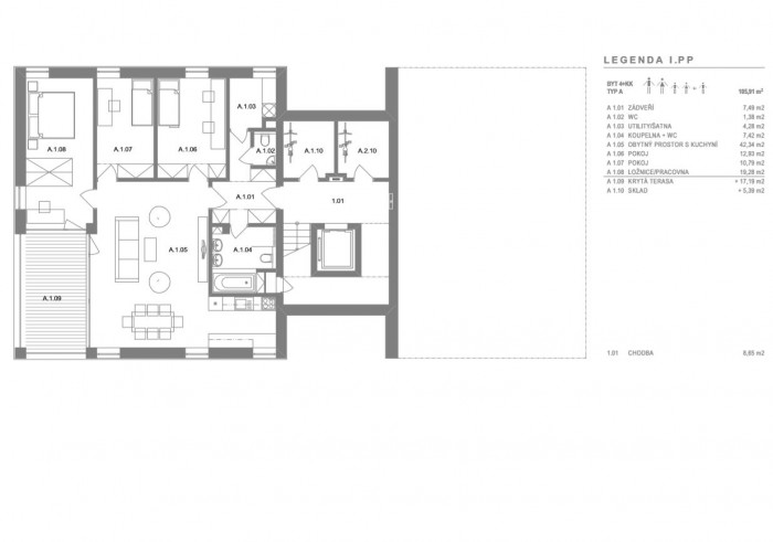 V každém domě je sedm bytů, každý s terasou s dálkovými výhledy. Skladebnost bytů je 2 x 2+kk, 1 x 3+kk a 4 x 4+kk, byty jsou jednoúrovňové, v podkroví mezonetové.