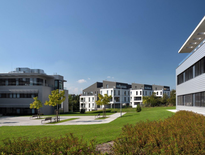 Domy se skládají ze dvou třípodlažních hmot s pultovou střechou propojených vertikálním komunikačním jádrem. Jsou orientovány kolmo k vrstevnici, hmoty jsou navzájem výškově posunuty o patro. Toto hmotové řešení se měřítkem přizpůsobuje rodinné zástavbě, zároveň se v dálkových perspektivních pohledech hmoty do sebe zamykají a doplňují tak hmoty objektů technoparku.