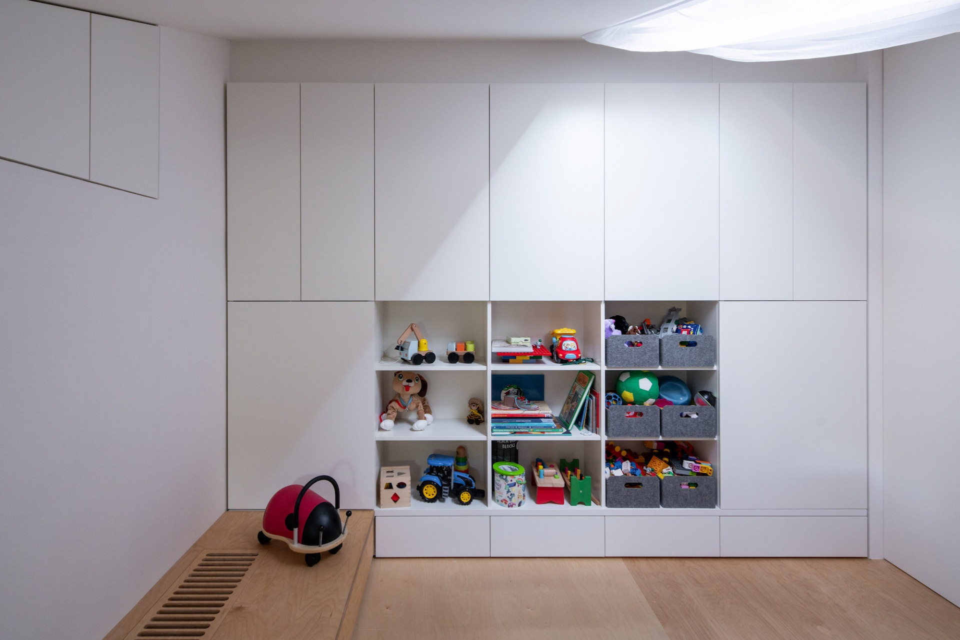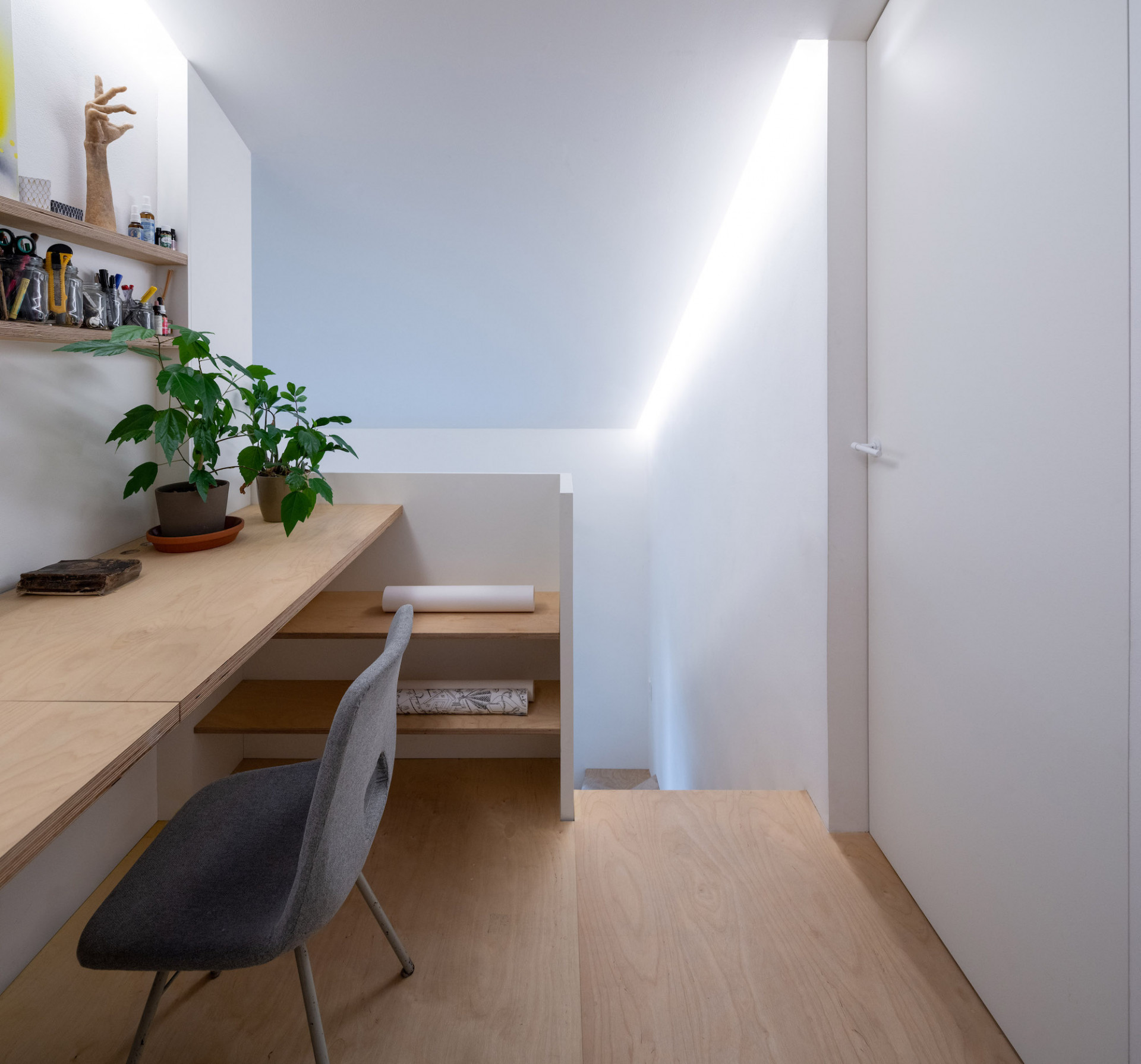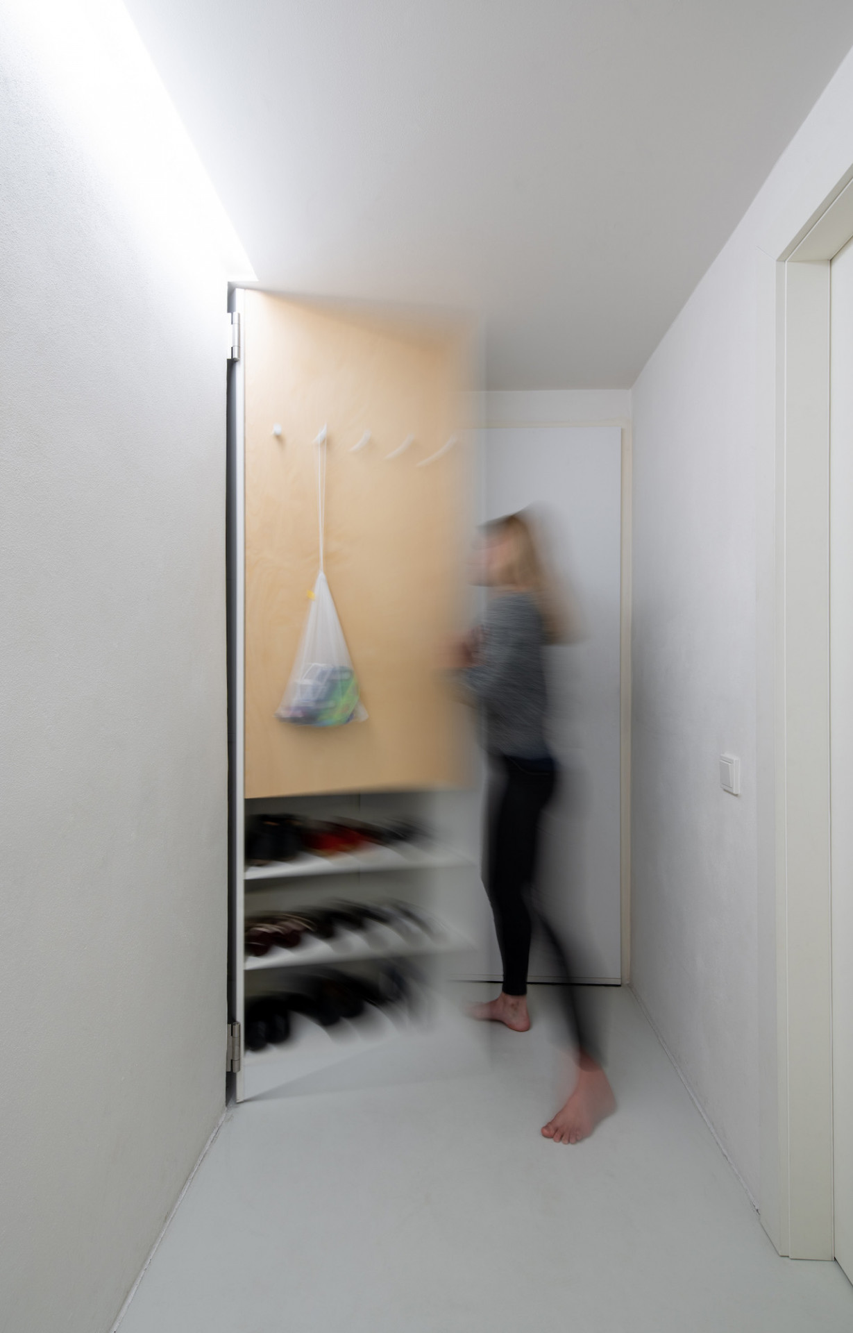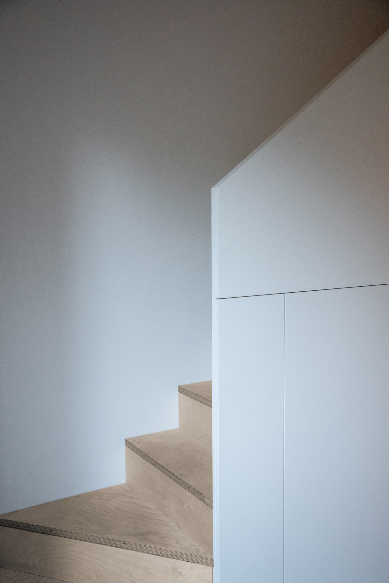 Světle šedá PUR stěrka na podlaze spodní úrovně, březová překližka jako pochozí vrstva ložnicového patra, v hlavní koupelně na podlaze a na exponovaných stěnách světle šedý kaučuk. Stěny v zázemí v prvním patře pokrývá světle šedé Pandomo. Atypický nábytek včetně schodiště je proveden v kombinaci bílého laku a březové překližky. Dveře se skrytou zárubní a posuvné dveře od firmy Bdoors s kováním Argenta. Nepřímé, ale výkonné osvětlení rámuje strop a umožňuje nerušeně vnímat vzdušný prostor. Středně šedé polstry a závěsy převážně z bílého lnu jsou vyrobené firmou Arthe na míru danému prostoru. Dodávka finálních povrchů a truhlářských výrobků od firmy Devoto pro nás byla třešinkou na dortu. Spolupráci jsme završili vlastnoruční výrobou terasy.