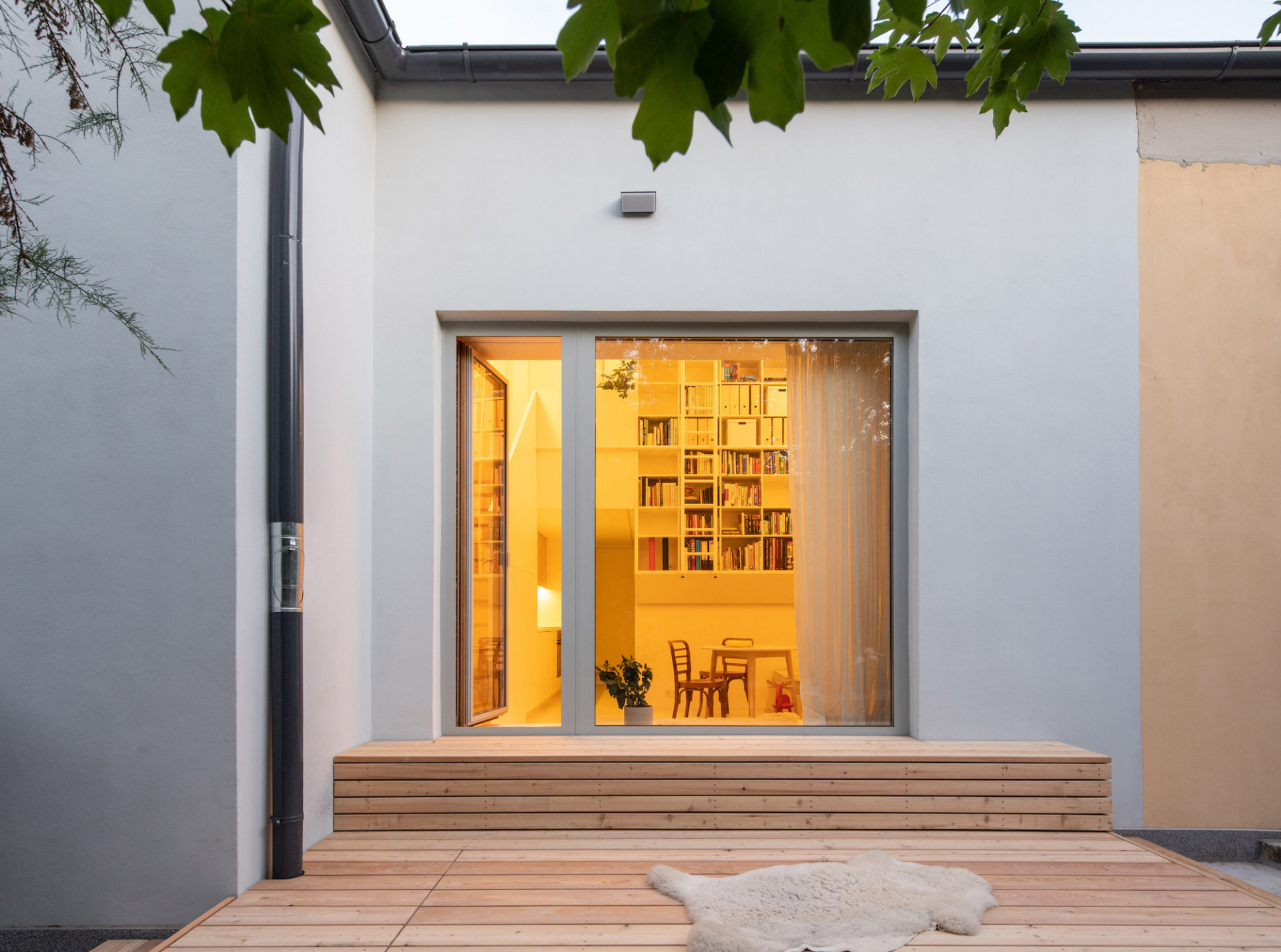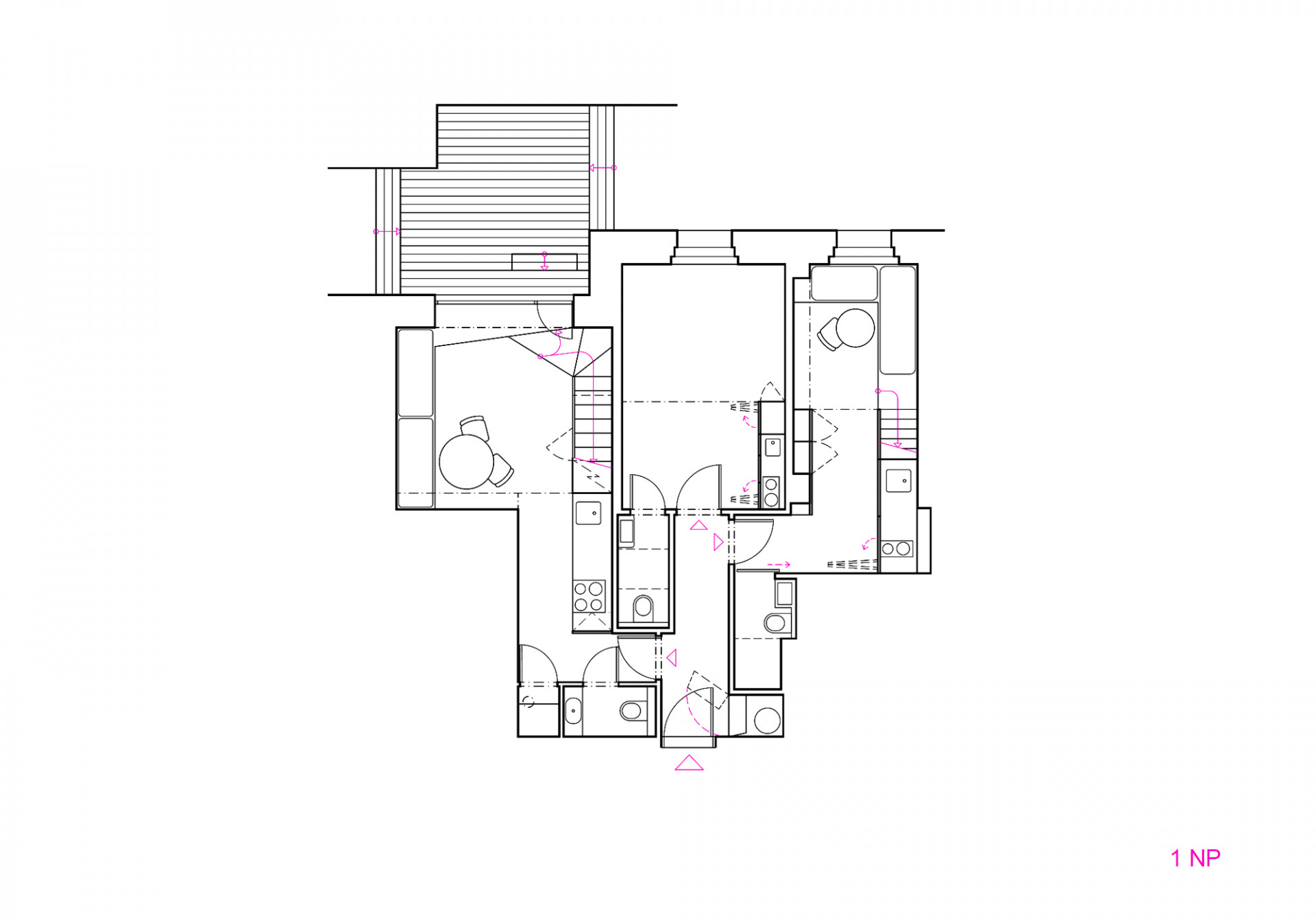 Vznikly tři jednotky spojené předsíní. Dvě s vlastním minimálním zázemím - 1 x garsoniéra a 1 x mezonetový prostor na třech úrovních. Třetí jednotka je domovem rodiny investora. Byt na spodní úrovni disponuje WC, malou prádelnou, do které vede shoz na prádlo z horního podlaží, kuchyní s malou spižírnou a obytným prostorem s velkým oknem a dveřmi na modřínovou terasu. Schodiště je tvarované tak, aby sloužilo nejen jako spojnice do druhého podlaží, ale i pro výstup ven. V podkroví je ložnice a dětský pokoj se spacím patrem ve vikýři, pracovna na galerii a hlavní koupelna.