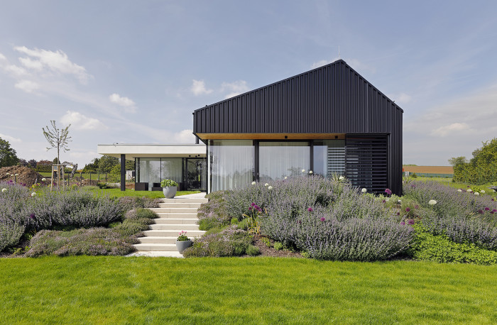 To, že je na domě použitý jako obklad černý plech, byla vlastně cesta hledání optimalizace. Michal přišel s touto inspirací z Nového Zélandu, kde se právě plechové domy (i když ne v černé barvě) často staví a klientům se tento koncept líbil.