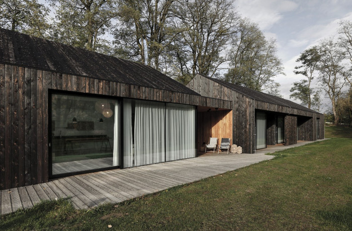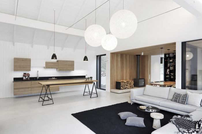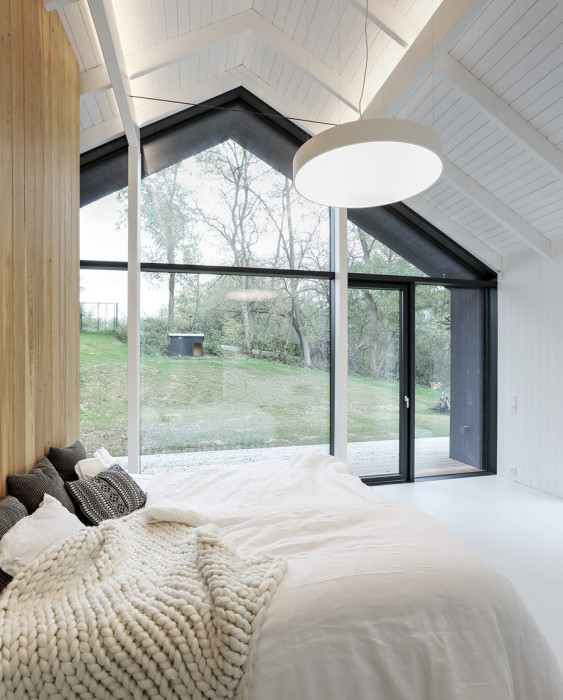 Dům v Neveklově pracuje se základním, archetypálním tvaroslovím rodinného domu se sedlovou střechou. Vnitřek v sobě ovšem ukrývá naprosto současný pohodlný interiér moderního bungalovu, vzdušný prostor plný světla a průhledů do velké zahrady. Kompozičně jde o dvě budovy se stejným sklonem střechy a rozdílnou výškou, lehce od sebe uskočené a spojené proskleným krčkem. Na dvou místech je dům v interiéru otevřený do krovu obloženého bílými prkny, v obývacím pokoji a v koncovém segmentu ložnice, což také umožnilo, aby se podoba domu se sedlovou střechou otiskla do proskleného čela ložnice.