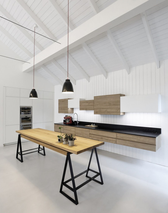 Veškerý nábytek jsme navrhli jako vestavný na míru interiéru: jde kombinaci bílých lakovaných MDF a přírodního olejovaného dubu. Drobné, kontrastní detaily jsou černé. V koupelnách jsou zařizovací prvky v matně černém odstínu.