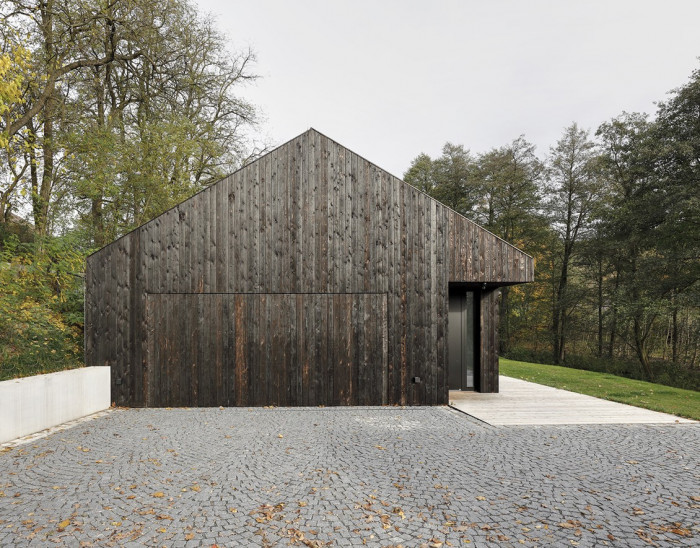 Konstrukčně se jedná o dřevostavbu, skeletový systém s instalační předstěnou. Fasády včetně šikmé střechy jsou provedeny starou japonskou technikou, jsou obaleny ručně hloubkově opalovanými modřínovými prkny. Abychom podtrhli minimalistický výraz domu, navrhli jsme skrytý zaatikový žlab. V interiéru jsou na obvodových konstrukcích použita prkna, natřená na bílo, vnitřní příčky jsou sádrokartonové, podlaha litá cementová stěrka, v koupelnách jsou použity stěrky na stěnách, v jedné z koupelen pak černobílé obklady.