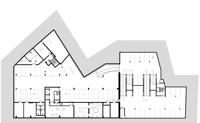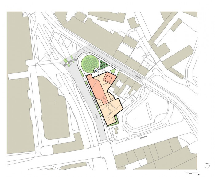 Stavba je rozdělena do dvou stavebních objektů. Administrativní budova s obchodními jednotkami v 1. np, parkováním a technologickým zázemím v 1. pp přiléhá k parkovacímu objektu. Hlavní vstup do administrativy se nachází na nároží při ulici Plotní. Druhý vstup ke komunikačnímu jádru pětipodlažní části se nalézá na ulici Dornych. Pět obchodních jednotek je umístěno v parteru budovy a jsou přístupné přímo z chodníku. Vjezd do podzemních garáží je umístěn z ulice Dornych po obousměrné rampě. V budově jsou dvě komunikační jádra se schodištěm a výtahy.