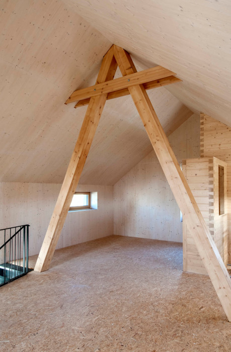 Drevená konštrukcia z červeného smreku je priznaná v interiéri, ktorý je kombinovaný s veľkoplošnými smrekovými preglejkami a oceľovým remeselne spracovaným schodiskom.