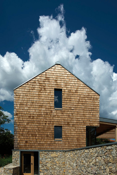 Strecha z rheizinku tvorí súčasť bezúdržbovej fasády z trvácich materiálov, ktoré sa prispôsobujú a začleňujú do prostredia: miestny kameň - neupravované drevo - zvetraná falcovaná strecha. Dôležitou súčasťou domu je jeho prepojenie zo záhradou, ktorú projektovala záhradná architektka Eva Wagnerová v duchu rešpektujúcim genius loci tohto výnimočného miesta.