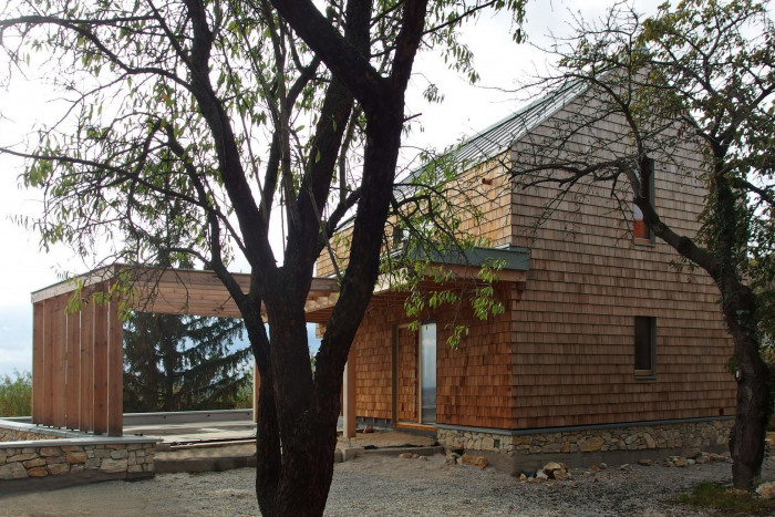Vegetačná strecha prepája interiér s exteriérom a existujúce vzrástle stromy zabezpečujú tak potrebný tieň na južnom svahu. Dom realizovala česká firma Taros nova, a všetky náročne atypove remeselne detaily tvorivo riešili na stavbe skúsení odborníci na drevostavby: Ing. Ján Nosálek spolu s architektom Ivanom Jarina.