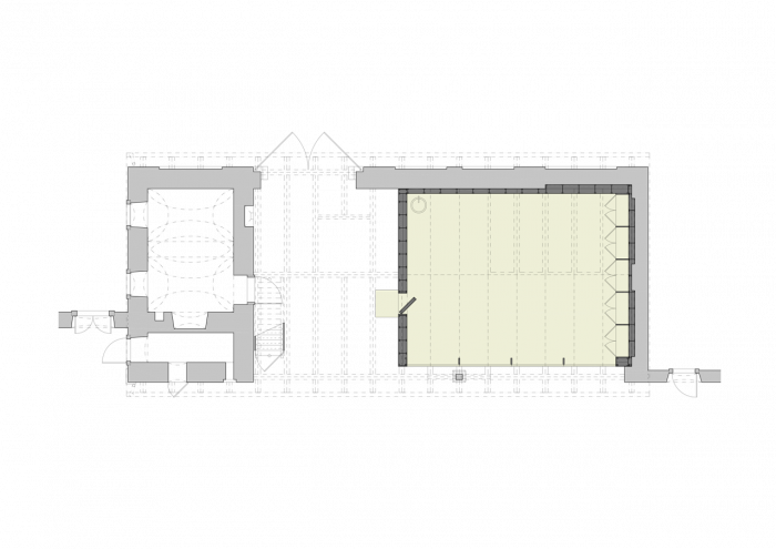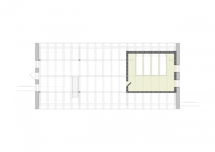 Nízké patro vestavěné do krovu tradičním způsobem slouží jako sklad pláten, barev i dokončených obrazů. Vstupuje se do něj stávajícím dřevěným schodištěm z průjezdu na půdu. Záměr od prvních úvah počítal s tím, že bude možné vše jednoduše odstranit a stodolu tím nijak neznehodnotit. Na sucho montovaná nová konstrukce je pojata jen jako výplň té staré.