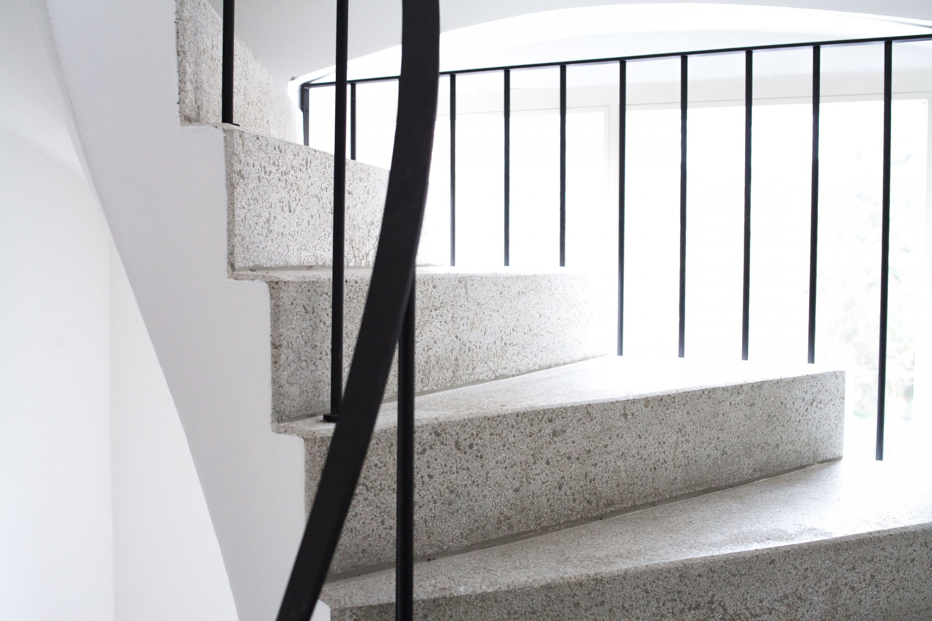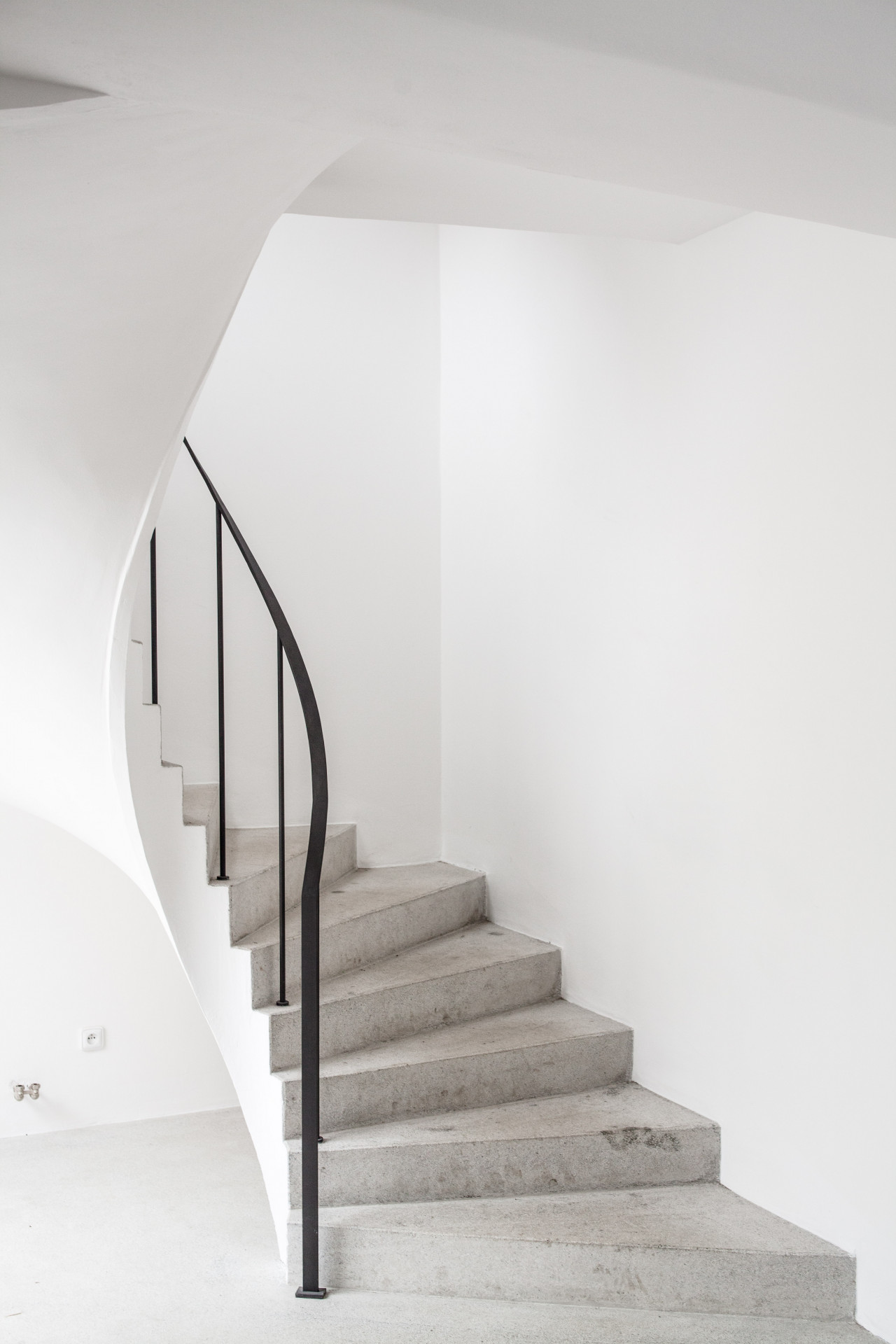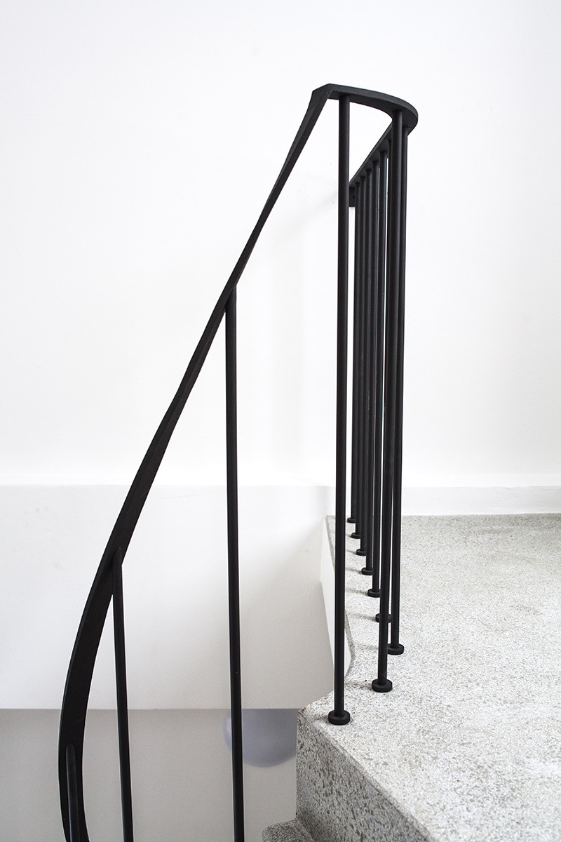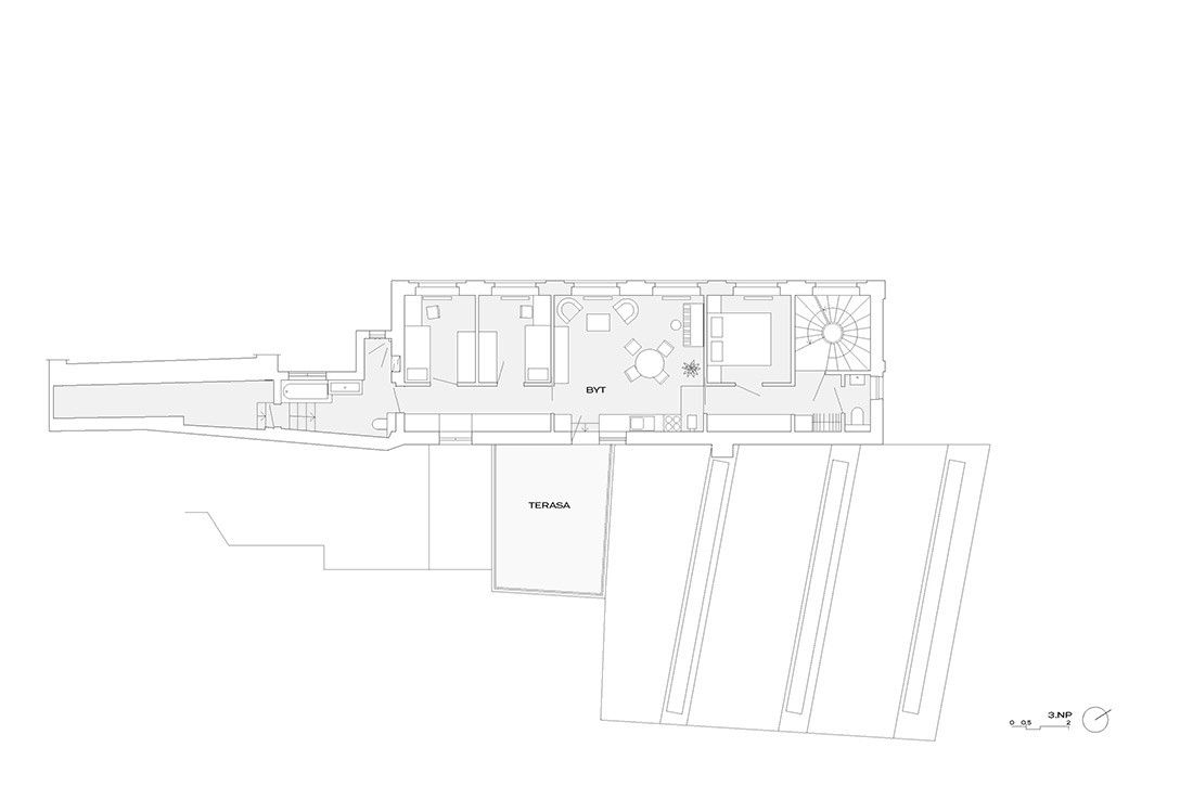 Úzký a protáhlý půdorys bytu v Železné ulici je řešený podobně jako kupé vůz vlaku. Jeho uspořádání je ovlivněno komplikovanou urbanistickou situací uvnitř městského vnitrobloku, část bytu totiž stojí na cizím pozemku. V centru dispozice se nachází obytný prostor s kuchyní, ze kterého je možné vystoupit na terasu ústící do soukromého dvora, v útrobách sousedního domu jsou pak umístěny koupelna a skladovací prostory. Byt je prosvětlen hlavně ze západu, velkorysými okny bývalé tiskárny.