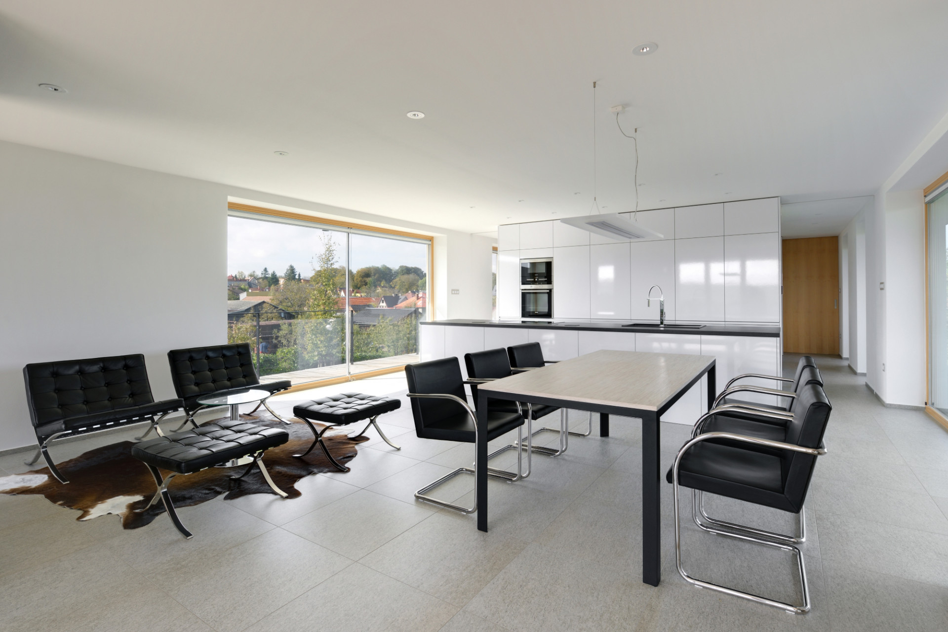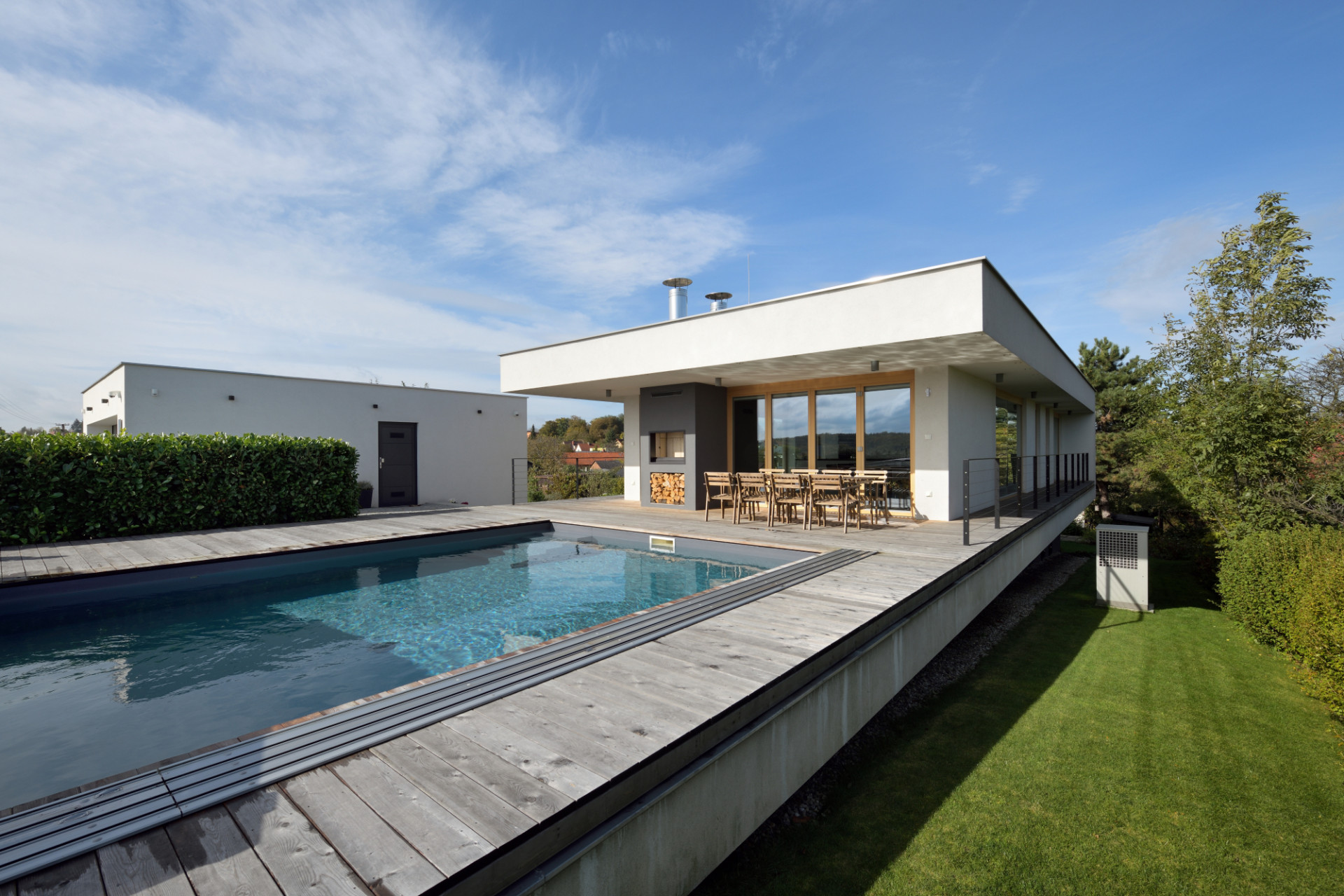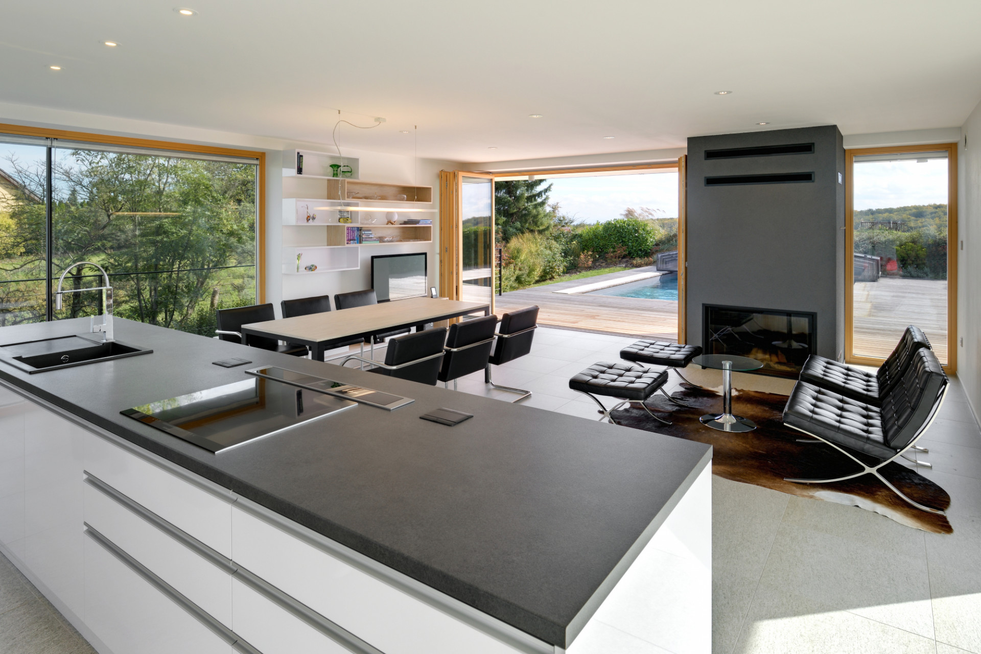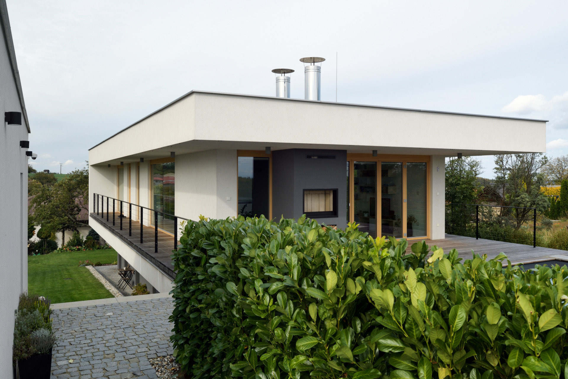 Morfologie terénu, světové strany a výhledy daly vzniknout konceptu paluby - společenského patra s bazénem, levitujícího na podnoži ložnicové části podpalubí. Uspořádání paluby umožňuje volný pohyb, prolínání interiéru s exteriérem a výhledy všemi směry. Volně plynoucí prostor, který se dá členit posuvnými stěnami.