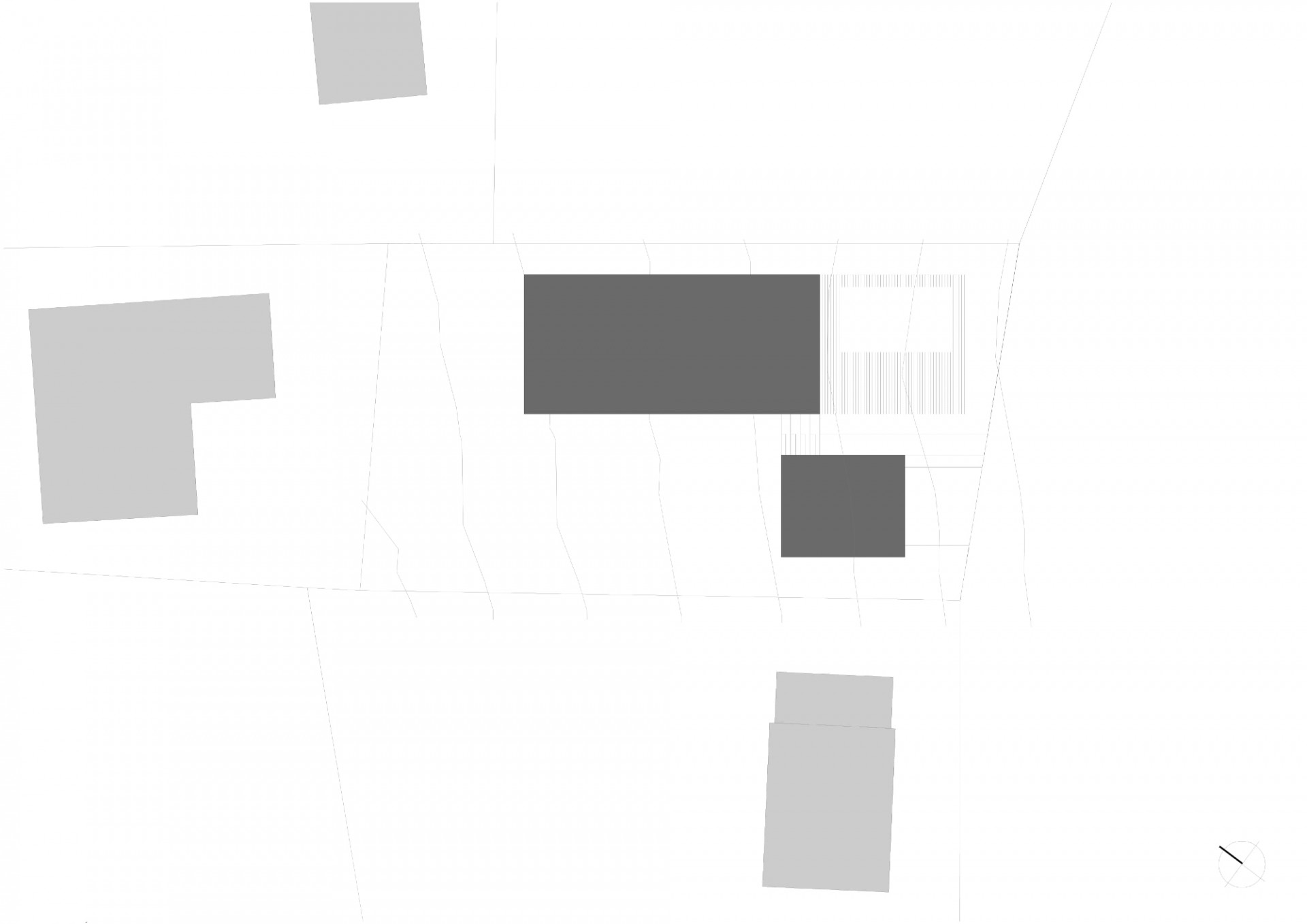 Samostatně stojící dvojgaráž spolu s domem člení pozemek na část poloveřejnou - terasa s jižním výhledem do krajiny a na část soukromou - zahrada přimykající se k identitě vesnice.