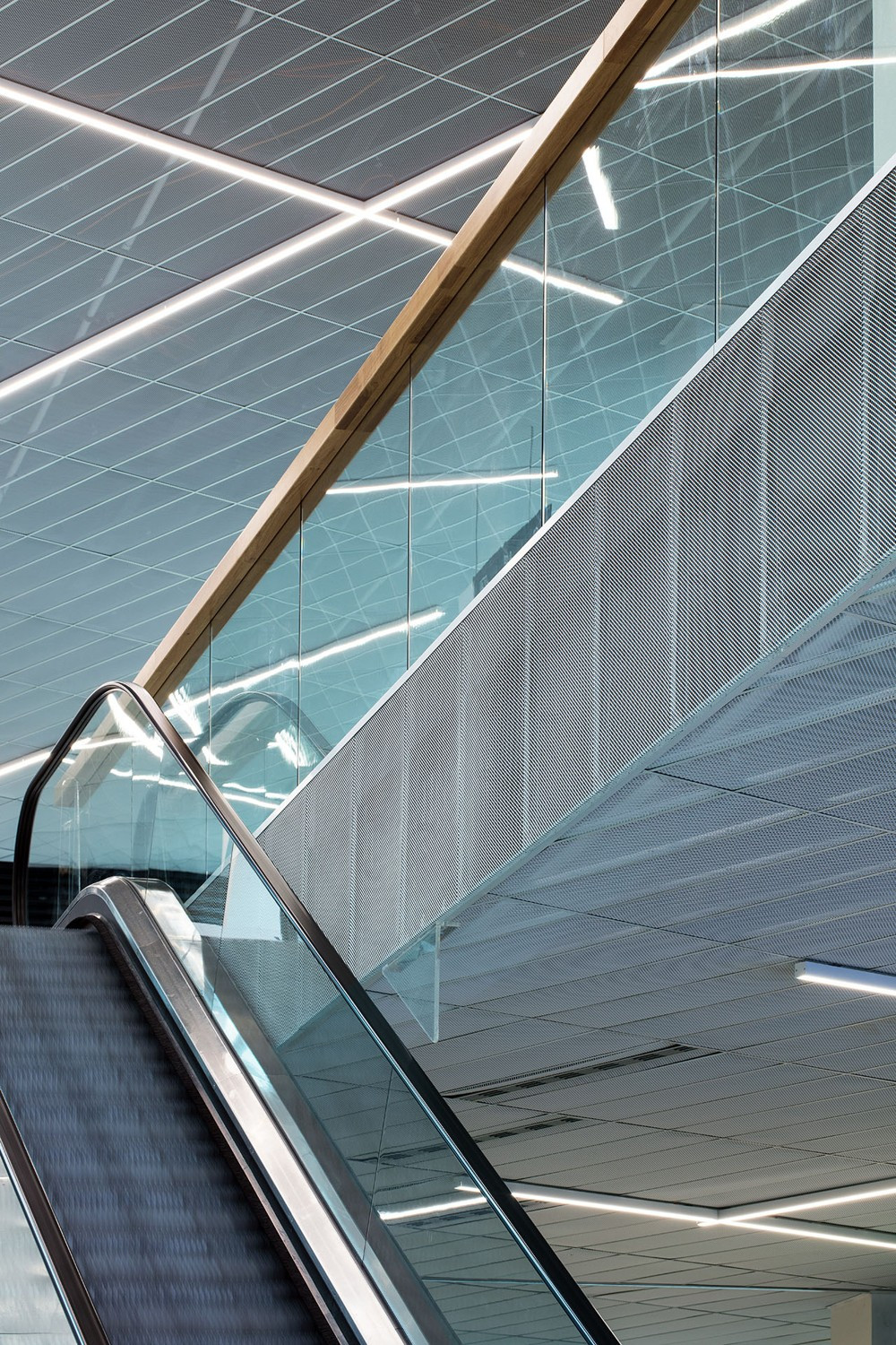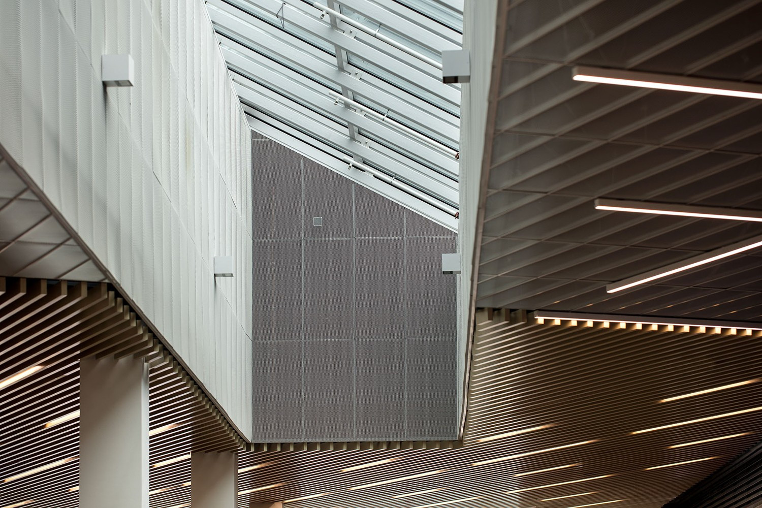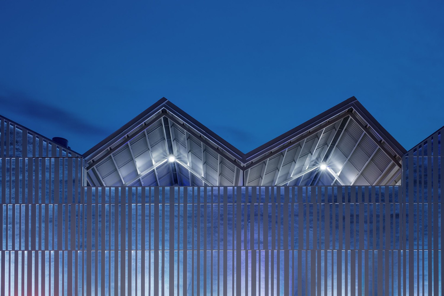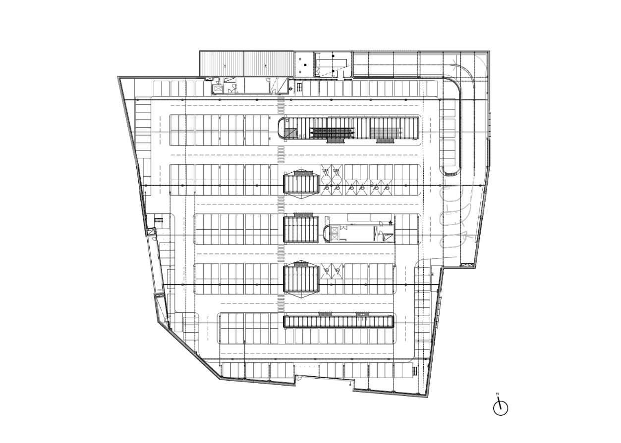 Strešný plášť nad plochami parkoviska v treťom nadzemnom podlaží tvoria jednoduché sedlové strechy pretnuté linkami sklenených svetlíkov nad priehlady a priestupy do pasáže. V dvoch miestach potom sedlovými strechami prestupuje kubus technológií s plochou strechou. Obvodové konštrukcie fasády na niektorých miestach dobiehajú až ku hrebeňom striech, miestami je ale fasáda ukončená rovnou atikou v úrovni podlahy či zábradlia a strechy sa potom pohľadovo vznášajú až nad pevnou strukturou stavby. Strešná krytina je navrhnutá plechová, z profilovaného/ trapézového plechu. Raster a profilácia plechov odpovidá rastru predsadených fasádnych lamiel, členenie jednotlivých prvkov strešných rovín svojou mierkou odpovedá mestskému charakteru a mierke okolných objektov.