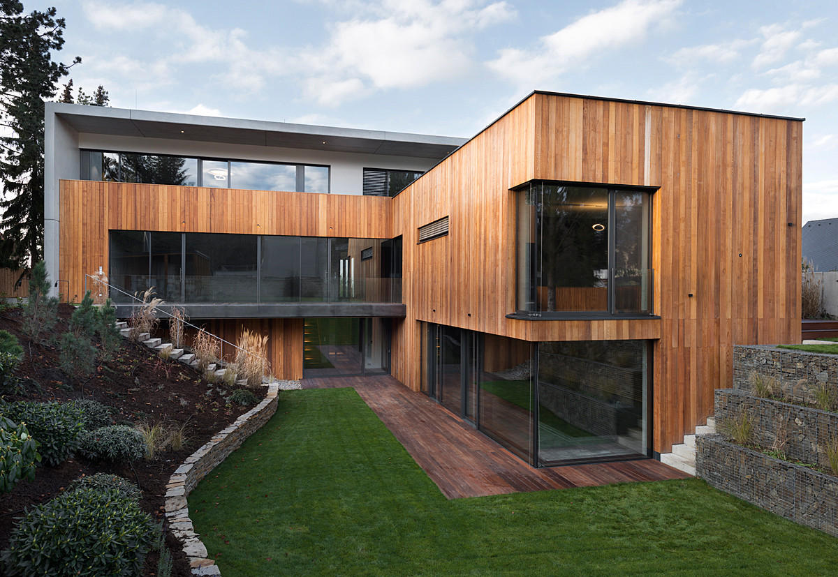Severní průčelí domu je tvořené pravidelným vertikálním rastrem, odpovídajícím menší potřebě oken tímto směrem, je tradičně omítnuto. Jižní průčelí, z něhož vybíhá výrazné křídlo základní obytné části do zahrady, je zcela odlišné, je svým rozsáhlým prosklením maximálně otevřené do výrazného reliéfu zahrady a jeho obložení cedrovým dřevem potvrzuje propojení domu s přírodou i intimitu prostředí v této části pozemku. Intenzivní propojení, prolnutí domu se zahradou a vytvoření chráněného soukromí v její části je podstatným principem našeho návrhu. V zahradě jsou vysázeny stejné druhy rostlin jako v nedalekém Průhonickém Parku, svažitější část landscapu pokrývají obdobně jako tam rododendrony.