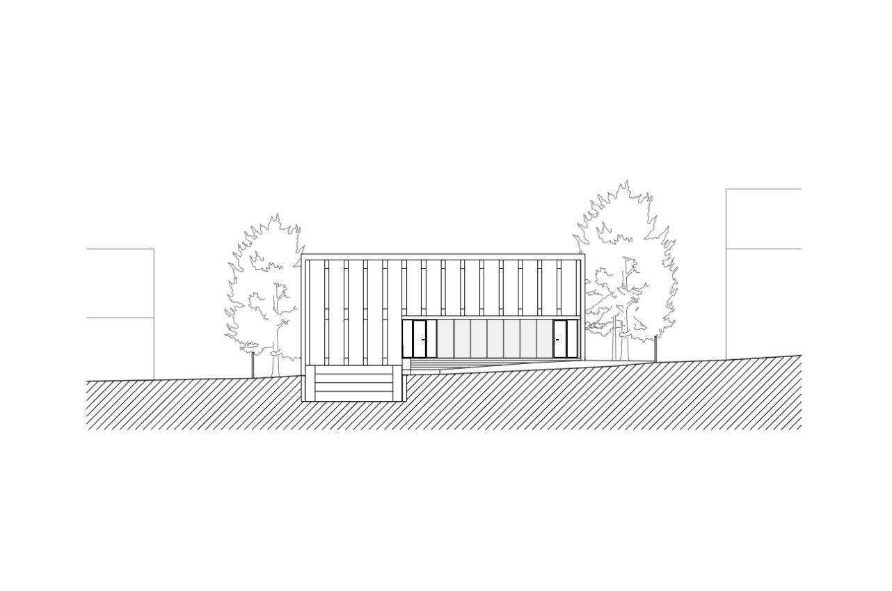 Protože jsme v prostředí ulice nenalezli existující architektonické hodnoty, ke kterým bychom se chtěli návrhem vztáhnout, zvolili jsme koncept jednoduché, striktní formy na sever do ulice a kontrastně k ní členitější formy na jih do zahrady. Prostředkem pro spojení obou odlišných forem domu (nikoliv pouze fasád) je velkorysý dvoupodlažní železobetonový rám nastavující „vysoký řád“ a architektonické měřítko celého objektu.