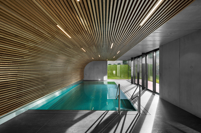Základní obytné funkce domu se odehrávají, tak jak bylo požadováno klientem, v rámci přízemí. Je zde prostorný obývací pokoj a jídelna s kuchyní dimenzovaná pro setkávání širší rodiny, dále pak hlavní ložnice a příslušné zázemí. V prvním patře jsou dva hostovské pokoje a pracovna se samostatným vstupem z ulice. V podzemním podlaží je vedle garáže a technického zázemí především osmimetrový bazén se saunou a malým fitness. Prostor bazénu je otevřený prosklenou stěnou do snížené části zahrady, která je zapuštěna z toho důvodu, aby poskytovala potěšení i pro tuto část domu.