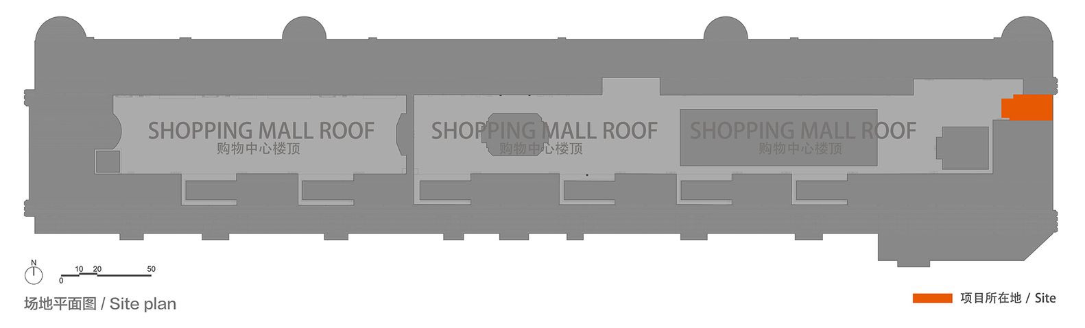 Lokalita tohoto projektu je velmi unikátní – jedná se o střechu velikého nákupního centra. Klient si přál na tomto místě postavit malou budovu, ve které bude moci odpočívat a scházet se s přáteli. Objekt se nachází v hlavní obchodní čtvrti města. Celé okolí je proto velmi rušné.