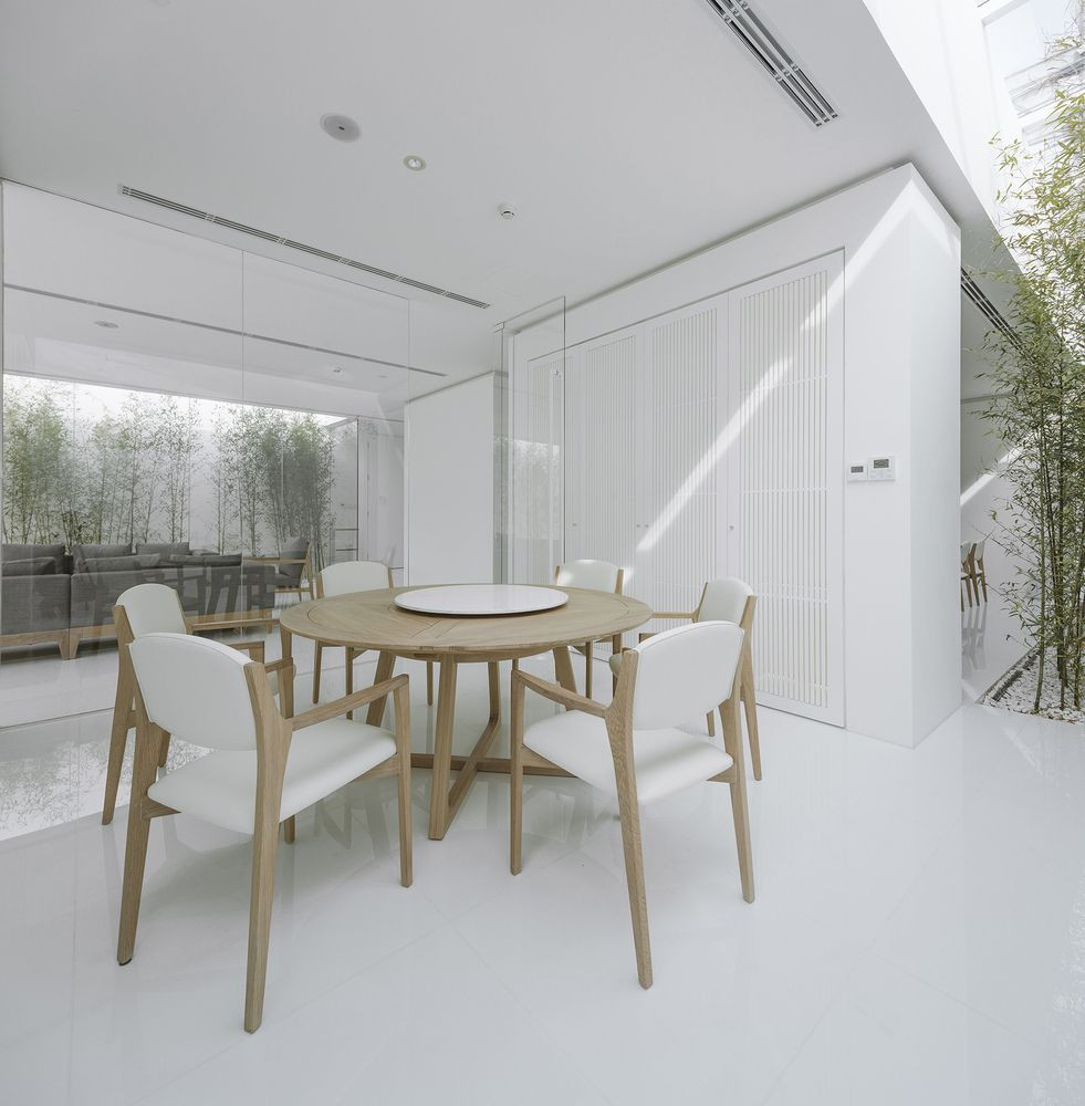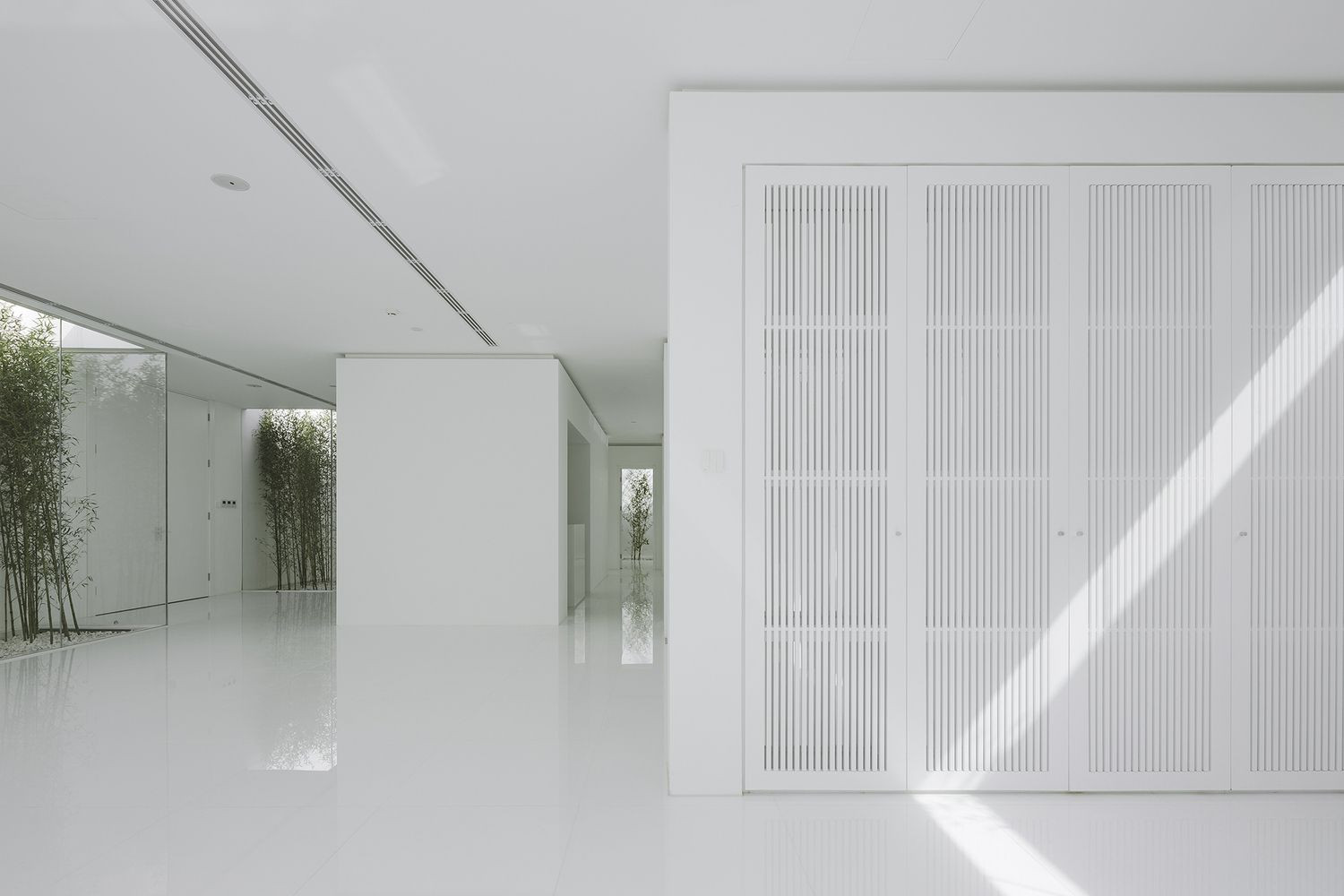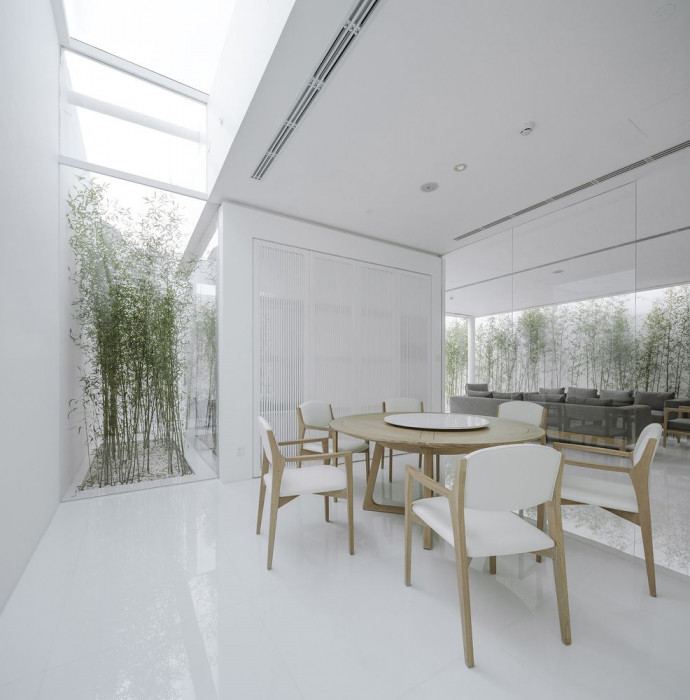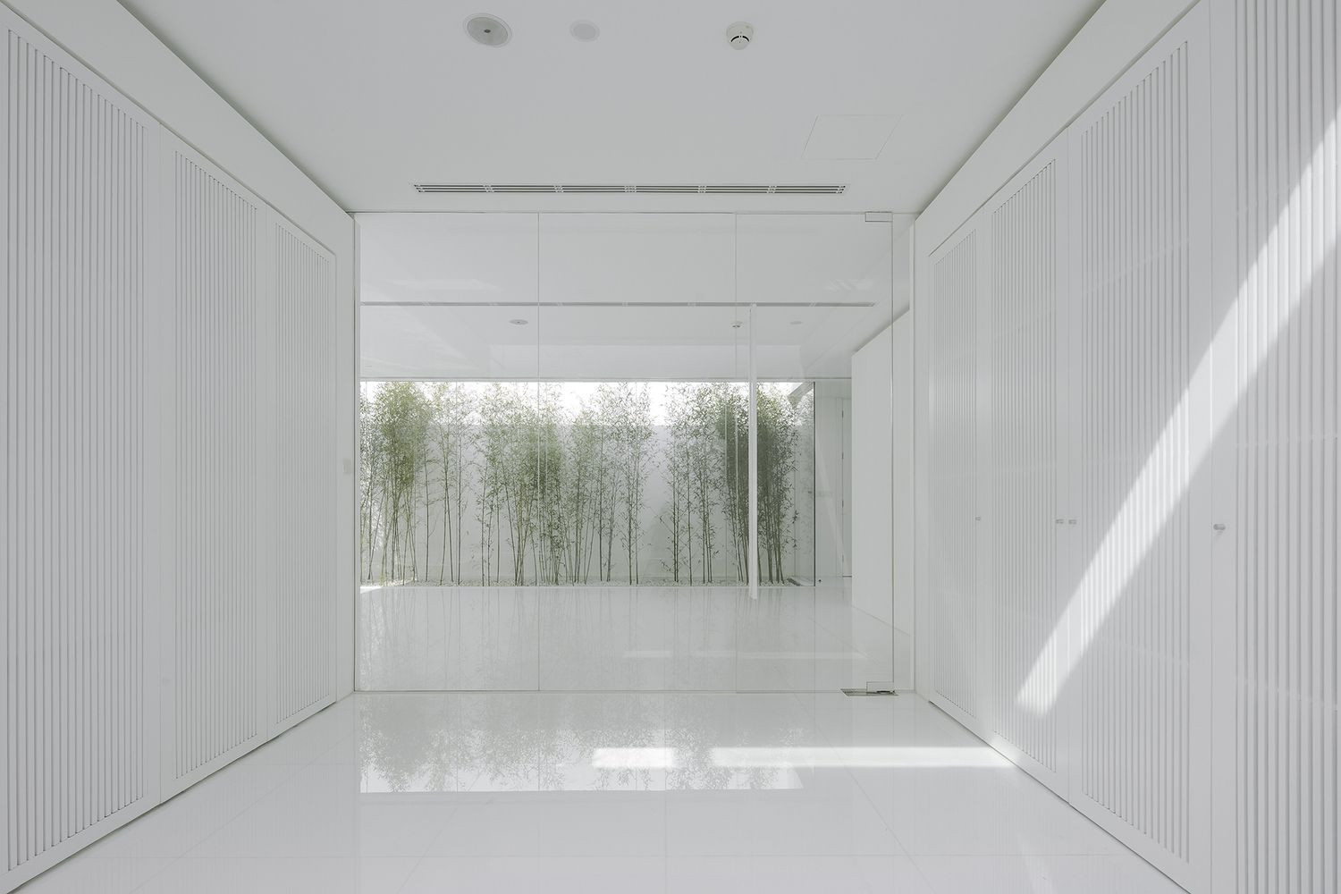 Světlo, sněhově bílá barva a zeleň bambusů představují hlavní prvky prostoru. Nádvoří, terasa a světlíky nestírají pouze hranici mezi interiérem a exteriérem, ale zároveň umožňují slunečnímu světlu vnikat ze všech stran až do vnitřku budovy. Bílá barva sjednocuje všechny prvky a materiály interiéru a vytváří tak atmosféru abstraktního prostoru.
