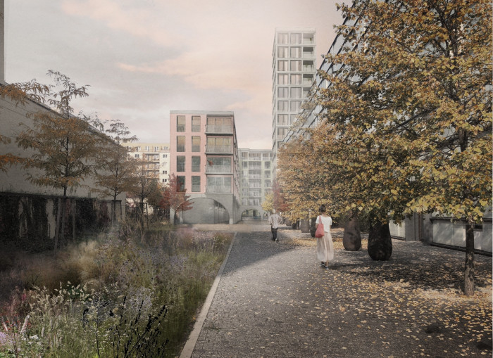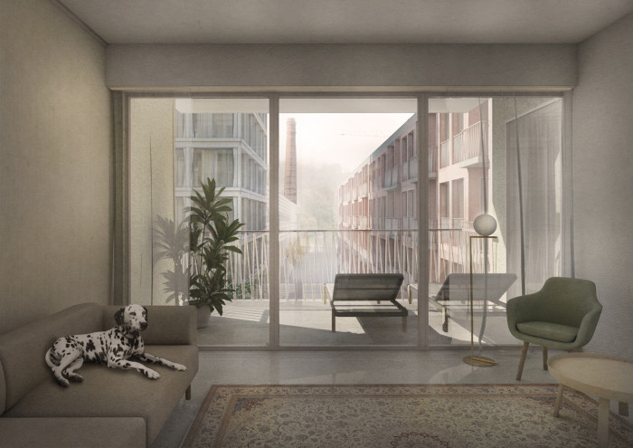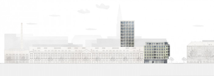 Na rozhraní dvoch Karlínov zíva veľká prázdna parcela neukončeného bloku. Nakukuje do križovatky troch malebných rohových domov. Akoby čakala na vyplnenie domom, ktorý bude nápadne dnešný, no tak trochu akoby tam s nimi vyrástol už dávno. Rímsa domu reaguje na ich výšku a hladký parter plynule naväzuje na baldachýn stromoradia. Prispieva útulnu ulice. Z nej vťahuje život do vnútrobloku a sprístupňuje dlhý priechod skrz, krytý loubím. Využíva prázdno nádvoria a otáča do neho dej. Formuje sa tretia hmota, kompenzujúca nezastavanosť nádvoria – vysoká veža s lukratívnymi bytmi a hotelovými izbami. Komín bývalej továrne odrazu nie je sám. Nájomné bývanie je síce prechodné, no cieľom bolo navrhnúť dom, neľahostajný k svojej výnimočnej polohe a hlavne dom, v ktorom sa bude dobre bývať.