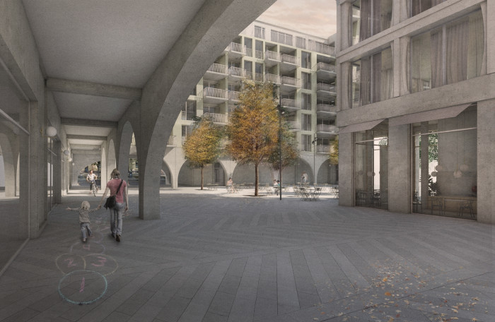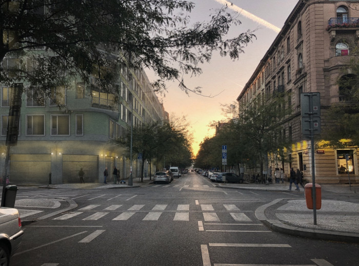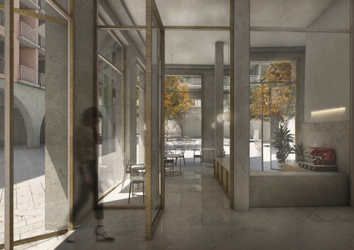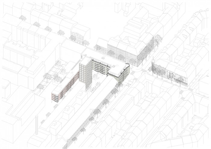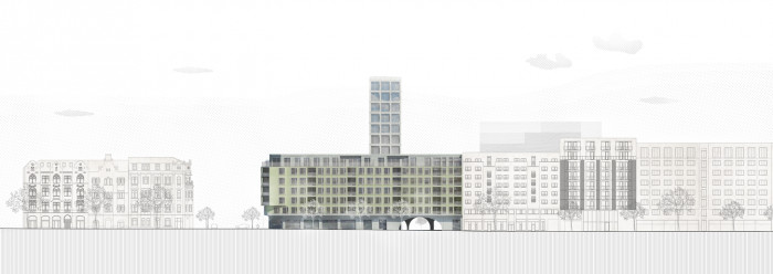 Dom od ulice výškovo reaguje na nárožných susedov, uzatvára blok a jasne tak definuje uličný priestor. Do križovatky vystrkuje iba arkier, ako zjemnenie nárožia s ambíciou využiť potenciál rohu. Parter je uskočený o 1,5 m a rozširuje tak chodník. Pevne drží fasádu, ktorú z ulice priveľmi nevnímam, ale viem, že tam patrí. Byty tvoria mix väčších, kvalitných bytov, ktoré využívajú celú dĺžku traktu a priehľad skrz, určené na predaj, a minimálne byty na prenájom nemenšej kvality. S narastajúcou výškou sa byty združujú a kvalita stúpa. Z tmavej severnej ulice je dom prepichnutý dierou, ktorá ponúka pohľad na život na nádvorí, na južné svetlo a zároveň na priechod skrz blokom, ktorý je krytý loubím s komerciou a vstupmi do nájomného domu.