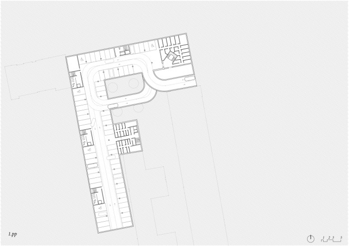 Dlhá, úzka hmota leží na hranici so susedom, neberie mu intimitu súkromnej záhrady a využíva hĺbku pozemku na maximum. Loubí naväzuje na existujúce detské ihrisko na vedľajšom pozemku, a vedie až na Pernerovu ulicu k Foru Karlín. Výškovo dom naväzuje na Cornlofts a oknami do verejného priechodu dáva najavo kontrolu. Štít domu sa pozerá na Vítkov a z Pernerovej ulice odkrýva tajomstvo dvora. Prázdno nádvoria je využité pre verejnosť, a je kompenzované vysokou hmotou 14-poschodovej veže, vykukujúcej spoza rohového domu. Upozorňuje na to, že v hlbokom pozemku sa niečo deje. Vytŕča ponad strechy, ale z ulice nepôsobí nepatrične. Vyjadruje súčasnosť a nutnosť nebáť sa zakonzervovanú Prahu ťahať do výšky. Programovo má pritiahnuť do nádvoria dej a prispieť meniacemu sa charakteru nájomného bývania hotelovou funkciou. Poloha Karlína vzhľadom k centru mesta, hlavným dopravným staniciam ako aj atraktivita lokality samotnej zdôvodňujú hotel využiť.