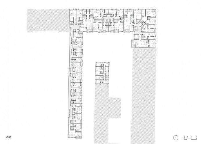 Vyššie podlažia, ktoré prerastú susedné Cornlofts ponúkajú nadštandardnú kvalitu bývania s jedným bytom na podlažie. Jedinečnosť, ktorú taký byt ponúka nemá v lokalite obdobu, preto ekonomicky opodstatňuje zdanlivý luxus. Na mieste sa tak miešajú tri kvality bývania – minimálne a univerzálne mestské nájomné bývanie s meniacimi sa obyvateľmi, kvalitné byty na predaj s nekonečným priehľadom skrz nádvorie na les Vítkova, a (doslova) vysoko lukratívne bývanie, využívajúce potenciál miesta, ktorý by inak ostal zanedbaný. Vo vnútrobloku je tak zrazu dosiahnutá diverzita a mestskosť, akoby šlo o kus ulice.