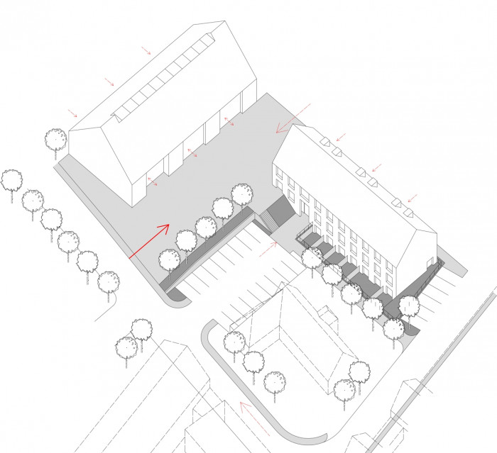 Samotný stavební program je rozdělen do dvou objektů - bytového domu s pronajímatelným prostorem a společenského sálu s knihovnou. Bytový dům je odsunut do bariérové polohy za současný rodinný dům, a je tak odcloněn od přístupové silnice Ke Smíchovu, opakuje tak polohu i hmotové řešení objektů v těsném sousedství, což je zejména patrné z pohledu z polí, záhumních cest. Budova sálu se naopak přimyká k cestě Ke Smíchovu, kterou považujeme za významovou osu území. Objekt je vůči silnici postaven štítovou stranou, čímž se dostává do výrazné pozice – do průhledu při cestě z návsi okolo zámku. Zároveň před objektem vzniká volné vydlážděné prostranství pro společenský život obce, který může ze sálu ven naprosto přirozeně expandovat.