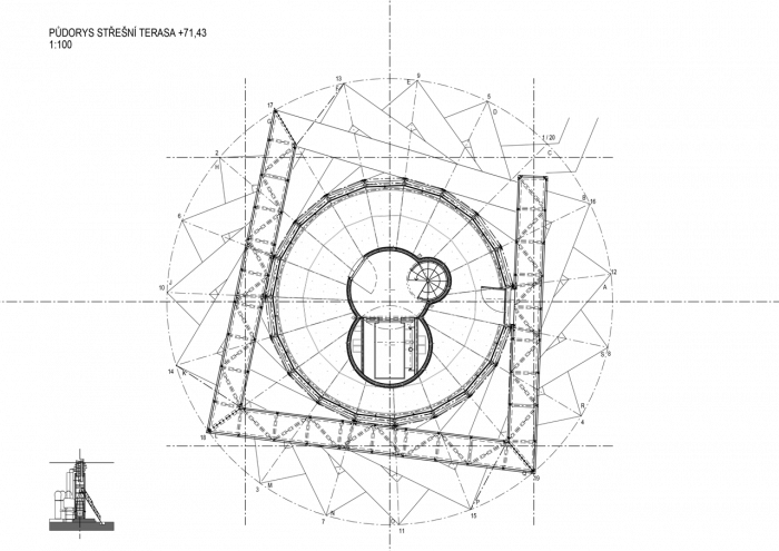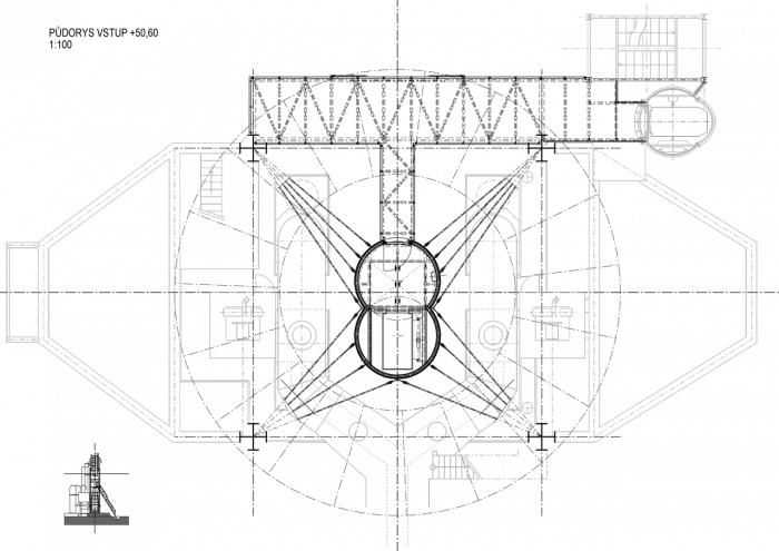 Osu – pevné jádro nástavby – tvoří ocelové souskruží trubek a je umístěno v ose tělesa samotné vysoké pece i rámové kostry. Toto ocelové jádro zajišťující vertikální dopravu osob výtahem a provozním točitým schodištěm je vně obaleno již výše zmíněným válcem s prosklenou fasádou. Vzniklý meziprostor pak v jednotlivých patrech – úrovních – tvoří hlavní užitný prostor se svými funkcemi. Podél proskleného válce, s podstavou 19-ti hranného polygonu, se v úrovni vrcholu kostry od evakuačního schodiště vine spirála – soustava lávek, propojující jednotlivá funkční podlaží vně objektu a zajišťující požární evakuaci osob z nástavby. Propojuje v úrovni A +55,825 prezentační prostor – součást naučné stezky po peci, v úrovni B +62,325 kavárnu, v úrovni C +66,225 klub a v úrovni D +71,425 střešní vyhlídkovou terasu.