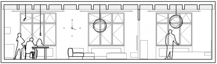 Použitím minima materiálov sme sa snažili byt zanechať čo najjednoduchší, napriek tomu teplý a komfortný. Pôvodný dubový parket bol použitý ako protiklad odhaleným rebrám stropnej betónovej konštrukcie, epoxidová podlaha bola použitá vo vstupných priestoroch a v kúpeľni. Kuchynská linka a nábytok vyrobený z radiálnej dubovej dyhy ponecháva výraz interiéru ešte viac geometrickým.